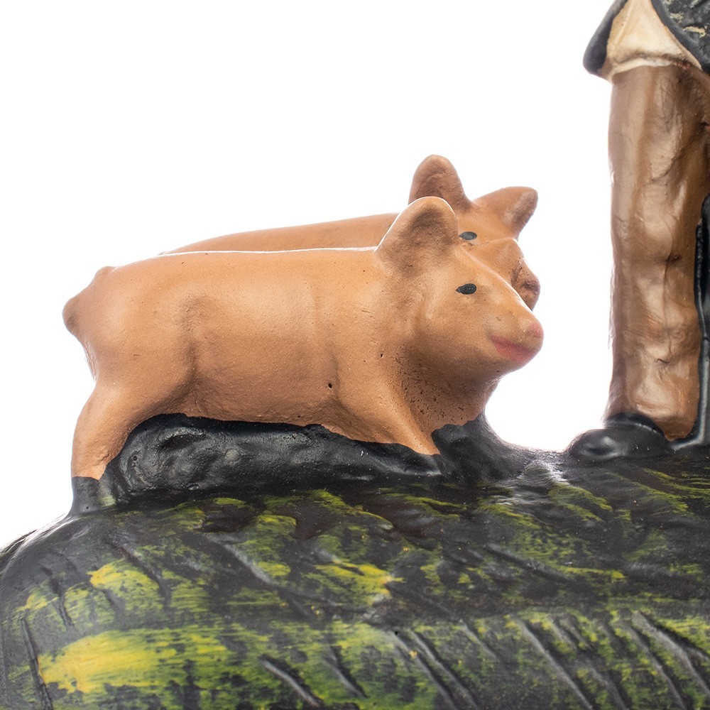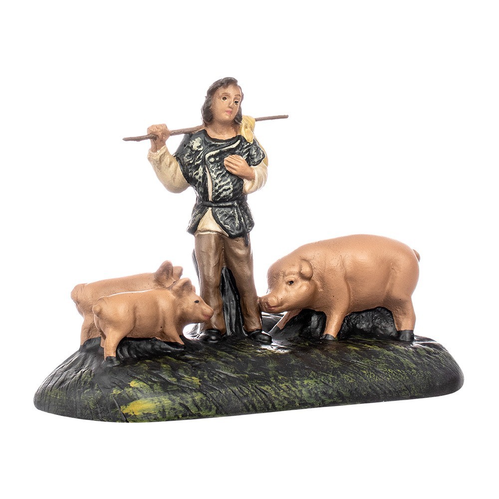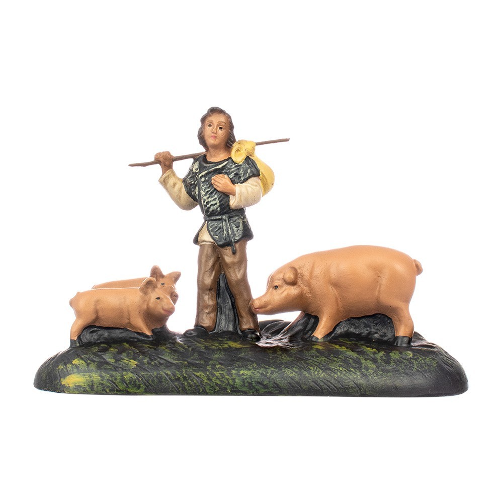 Nativity statues in plaster: Farmer with pigs 15 cm. Shepherd with three pigs. Made of plaster, entirely handpainted with patina finish. Made by the Barsanti firm, which was founded in 1900 by Carmelo Barsanti, who opened a workshop specializing in plaster statues dedicated to sacred art and nativity scenes.