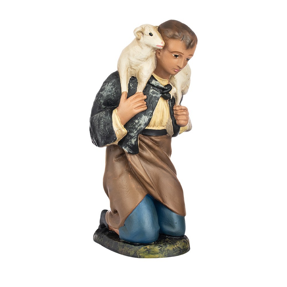 Nativity statue in plaster. It depicts a shepherd kneeling with a lamb on his shoulders. Finely hand-painted with patina finish. Made by the Barsanti firm, which was founded in 1900 by Carmelo Barsanti, who opened a workshop specializing in plaster statues dedicated to sacred art and nativity scenes.
