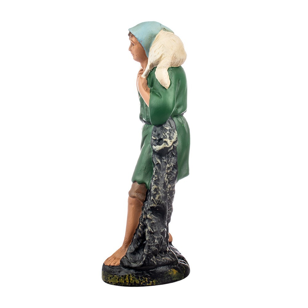 Shepherd with lamb on his shoulders. This statue is entirely made of plaster and is suitable for 20 cm nativity scenes in plaster. Made by the Barsanti firm, which was founded in 1900 by Carmelo Barsanti, who opened a workshop specializing in plaster statues dedicated to sacred art and nativity scenes.