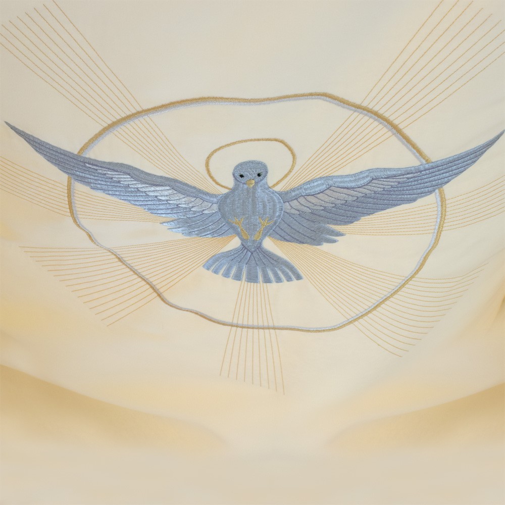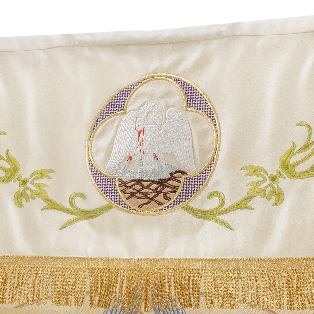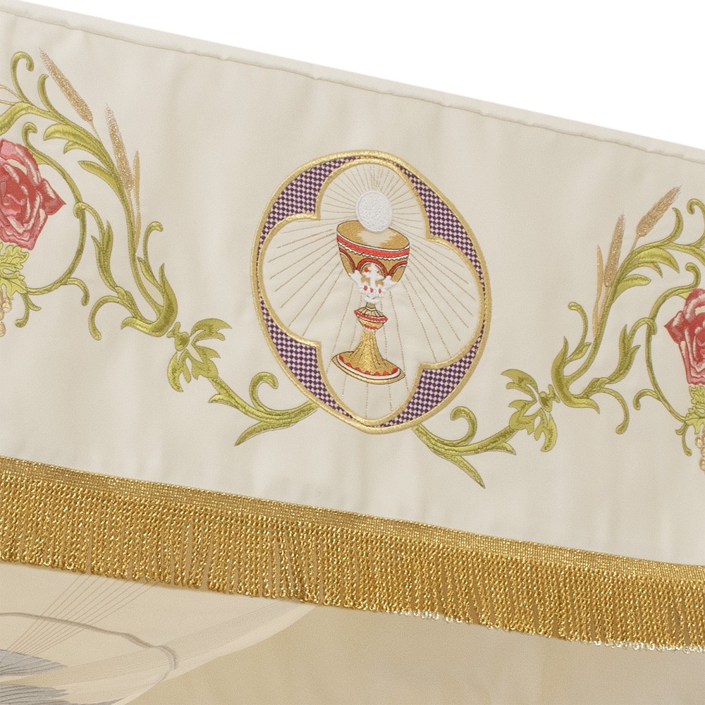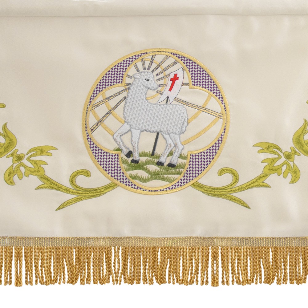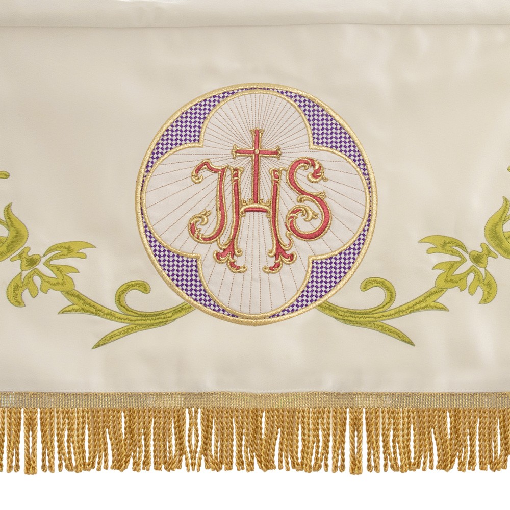 Made of excellent quality durable polyester. The embroideries depict a chalice, the easter lamb and the JHS symbol, surrounded by roses and several other decorations.