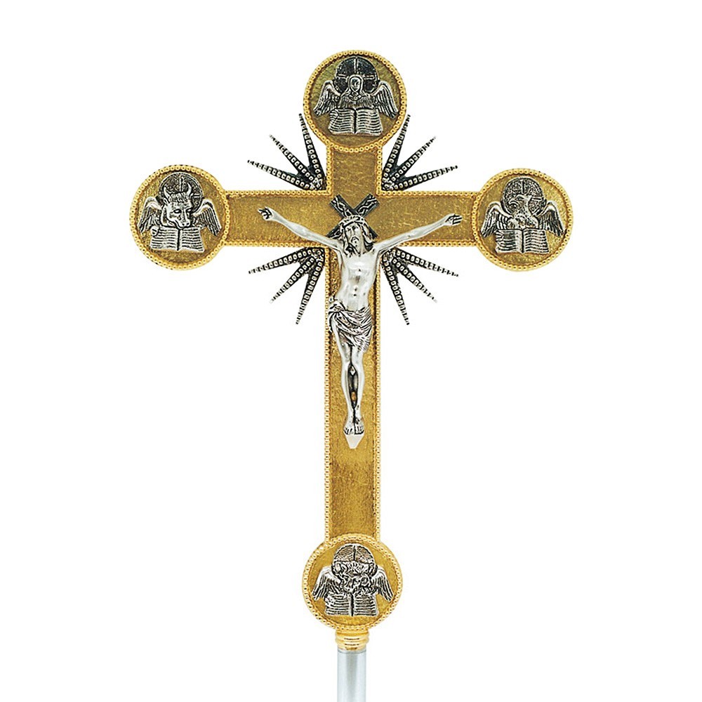 This processional cross is made of cast brass and features symbols of the four Evangelists at the sides. Embellished with rays of light. The cross is provided with a 150 cm tall shaft which can be disassembled.