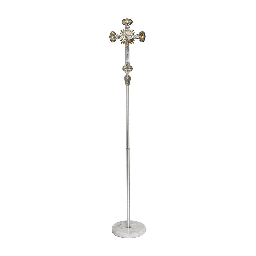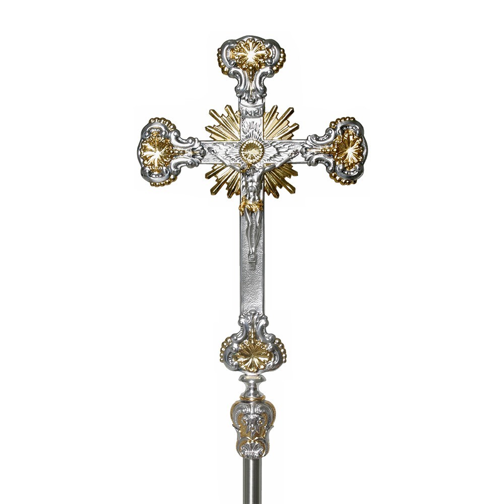 Processional cross in baroque style made of two-tone brass. The cross depicts rays of light and the Holy Spirit. The shaft is 150 cm tall and can be disassembled in two pieces of 75 cm. Ideal both for indoors – in the Church – and outdoors – in the city streets. Made in Italy by a leader company in the manufacturing of church furnishings, offering a wide range of top quality products.