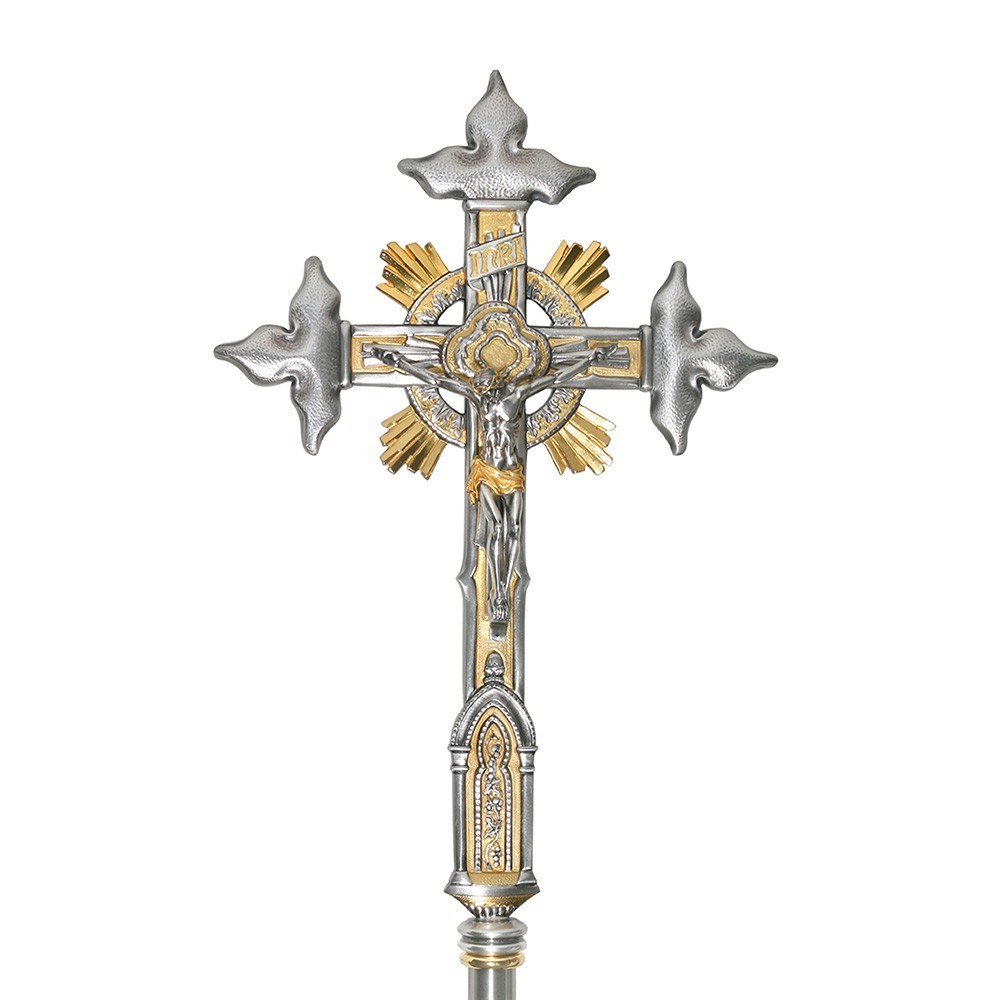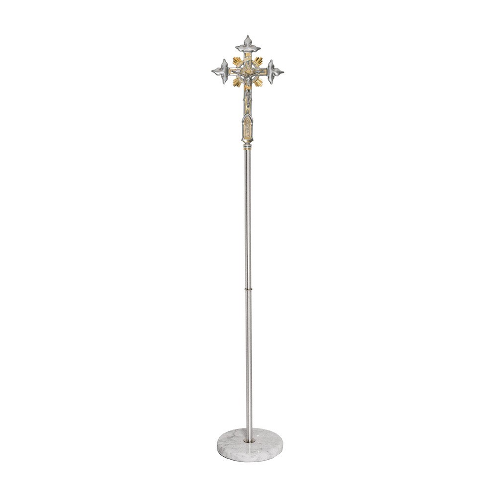 Processional cross made of two tone brass with gold and silver finish. Complete with halo of rays. The shaft is 150 cm tall and can be disassembled in two pieces of 75 cm. Ideal both for indoors – in the Church – and outdoors – in the city streets.