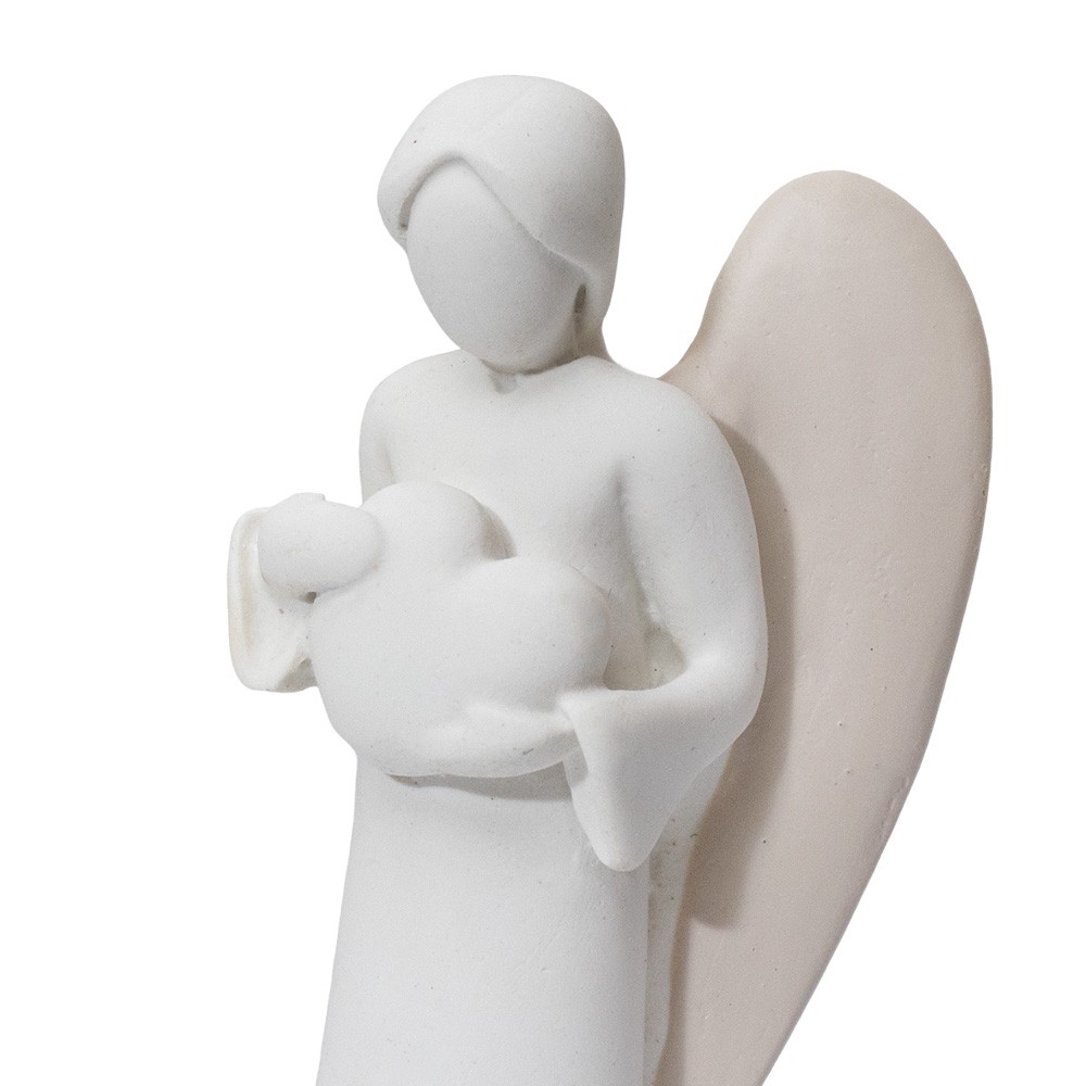 Angel in white resin with heart in his hands and dove-grey wings.