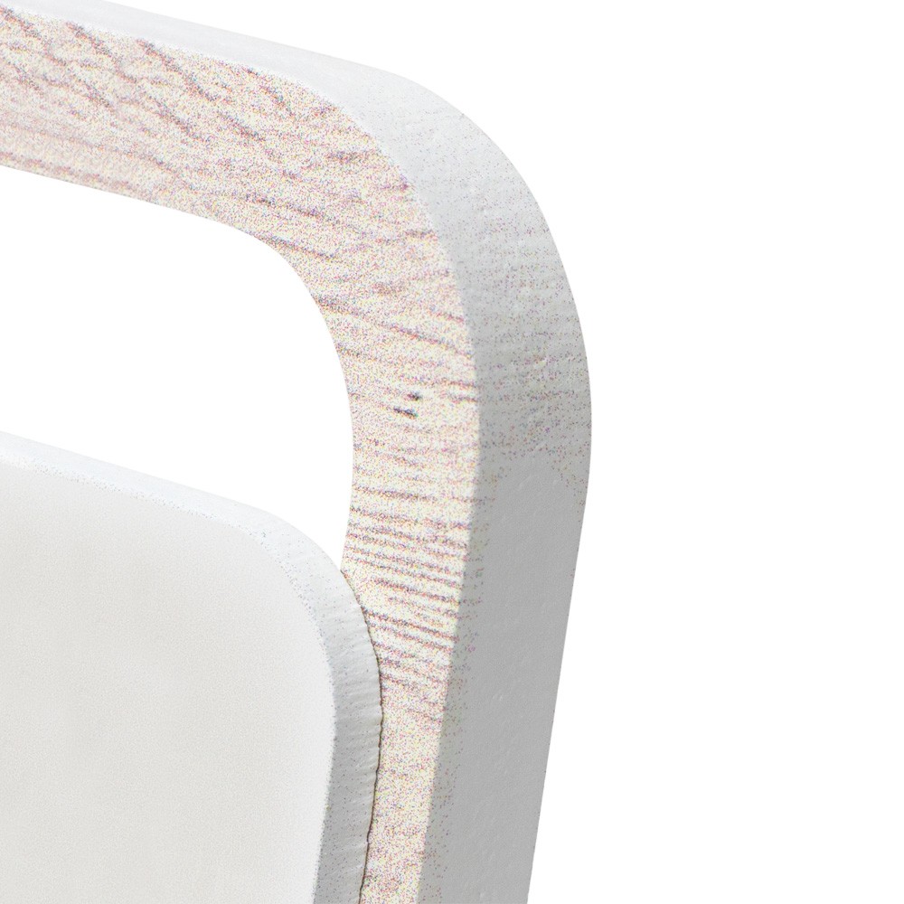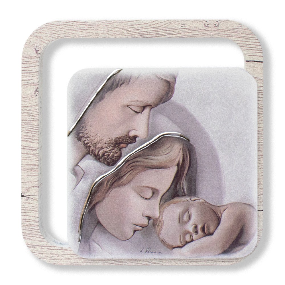 Lovely picture in light wood with image of the Holy Family painted with pastel colors and enriched with silver ornaments.