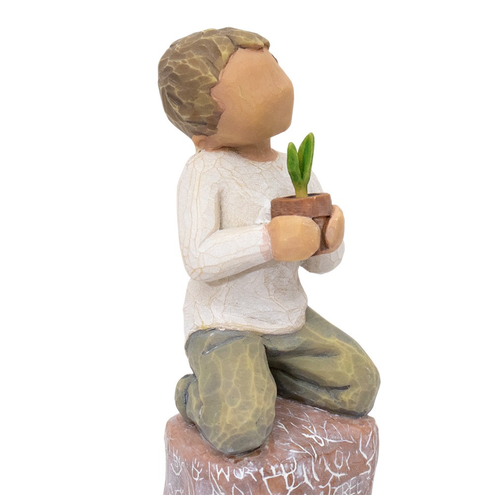 This wonderful sculpture depicts a child/boy holding a small plant in his hands while sitting on a rock. The message of the figurine is that of protecting and taking care of everything.