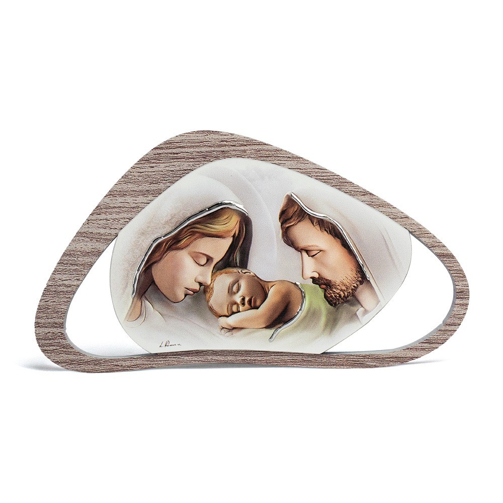 Small picture inlight wood entirely handpainted. The image depicts the Holy Family and is enriched with ornaments in laminated silver.