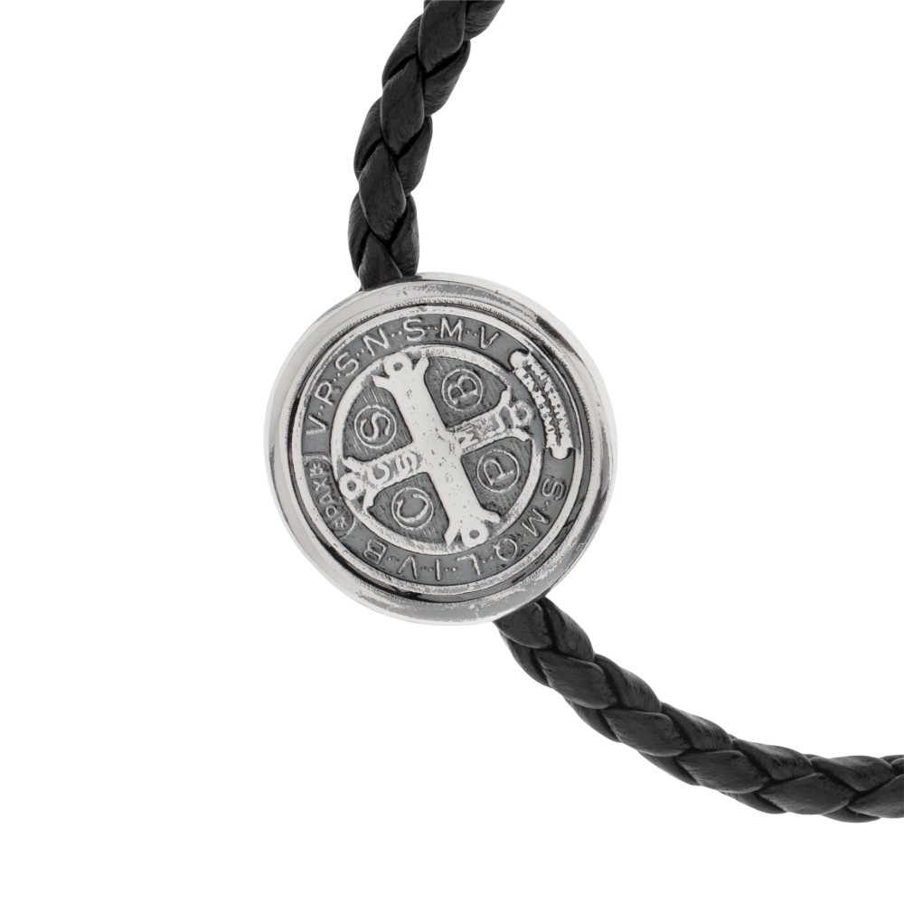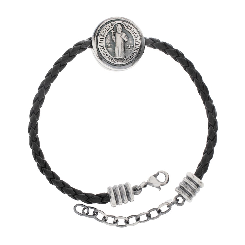 Black leather bracelet with brass medal depicting Saint Benedict.