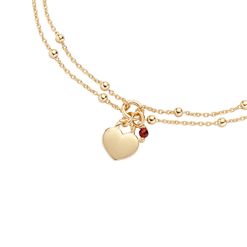 This double-strand bracelet is entirely made of gold-plated 925 silver and features a heart-shaped pendant and a ruby bead.