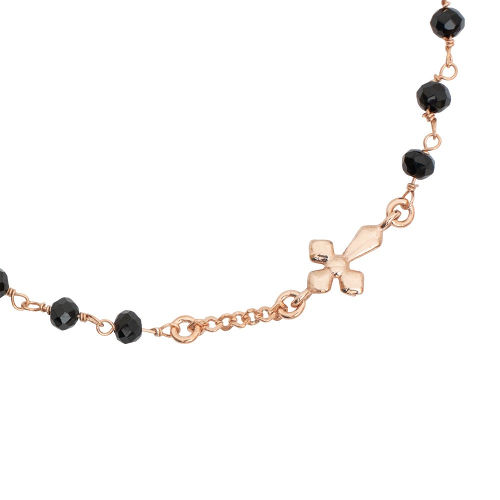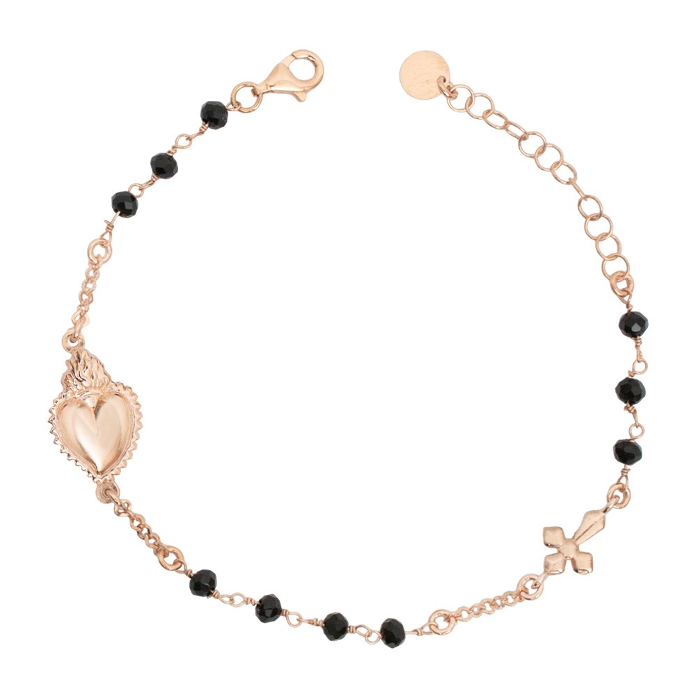 This bracelet is entirely made of rose-plated silver and features black stone beads, a cross and the Sacred Heart of Jesus.