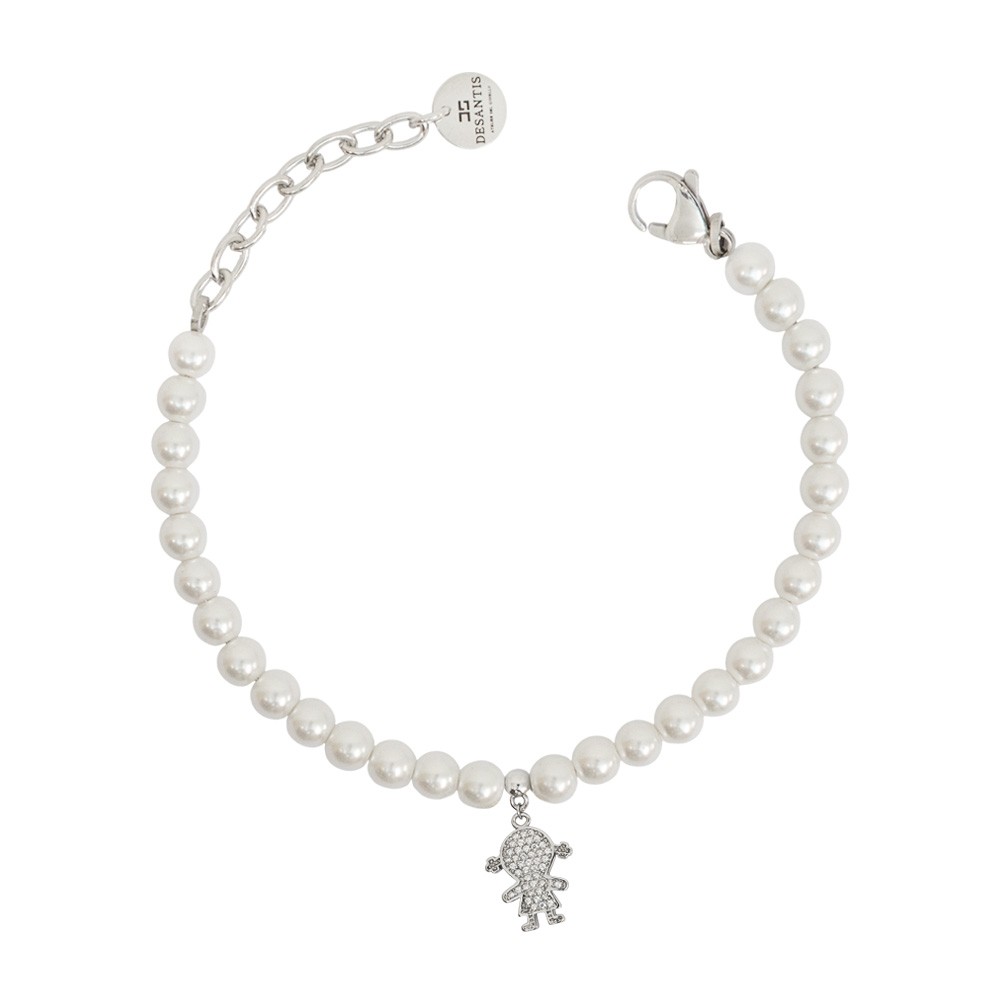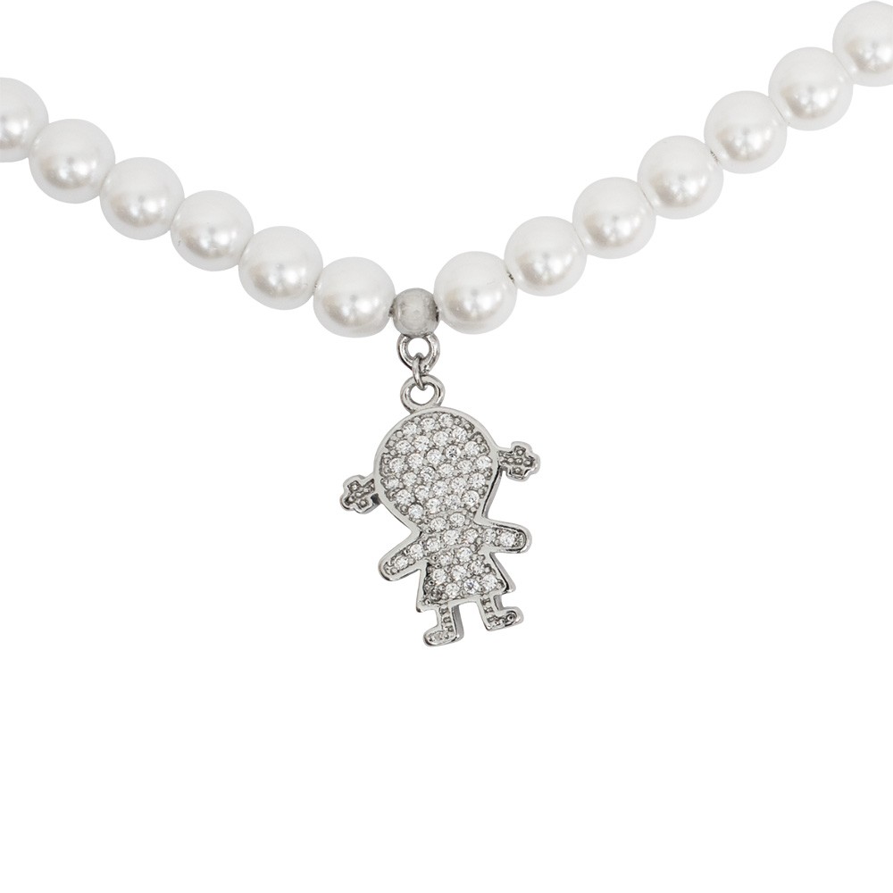 Elegant bracelet adorned with delicate white pearls and finished with a stainless steel clasp and extender. The dangling girl-shaped charm is embellished with sparkling cubic zirconia, adding brightness and grace to the piece.