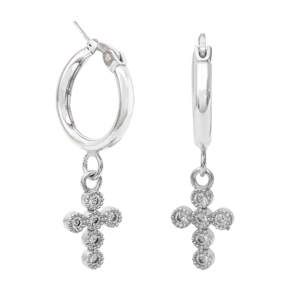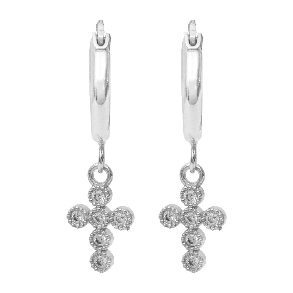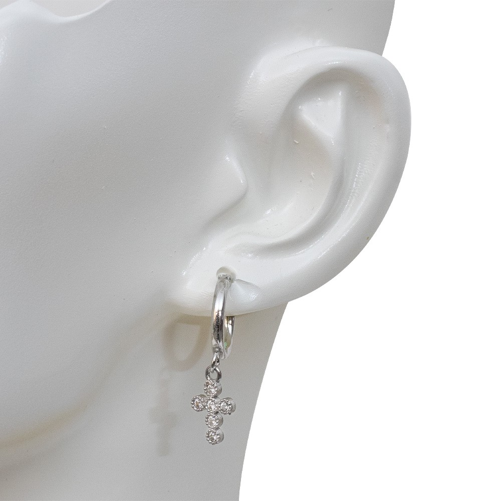 Ring earrings in 925 silver with cross pendant enriched with white zirconias. Snap closure.