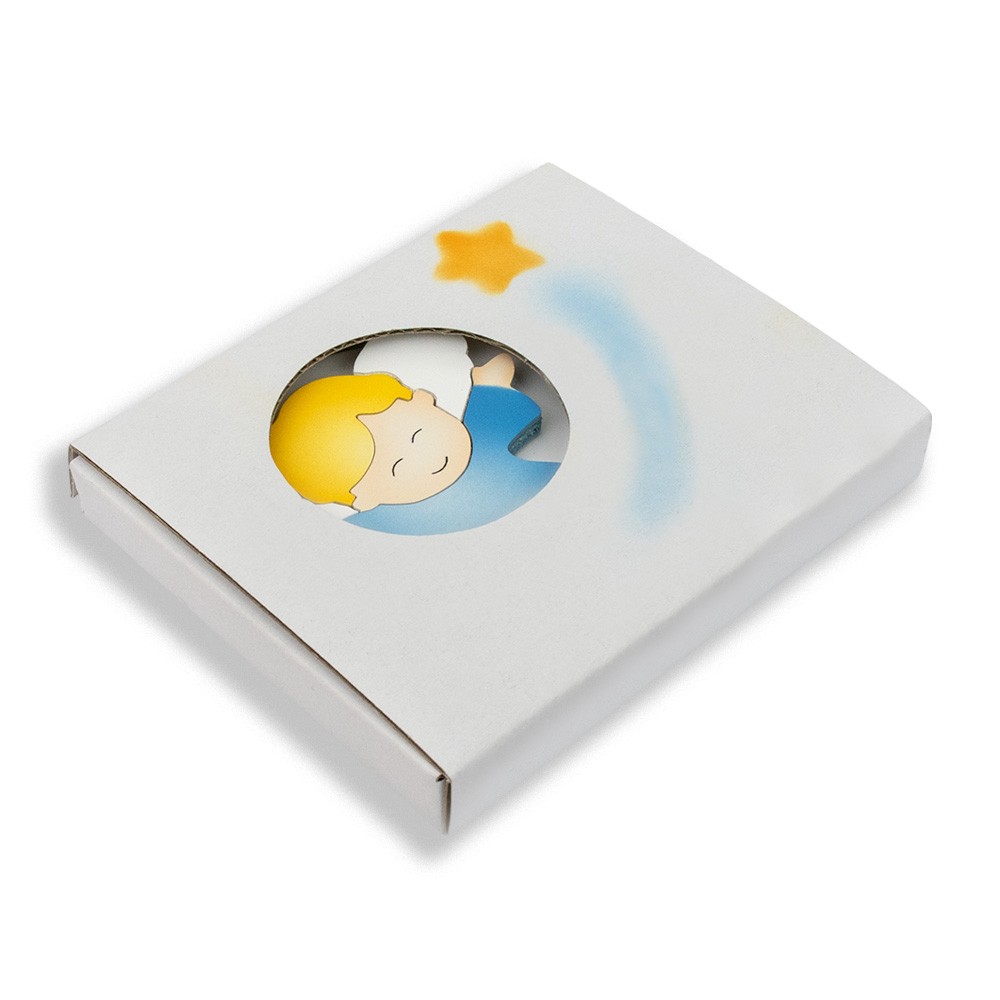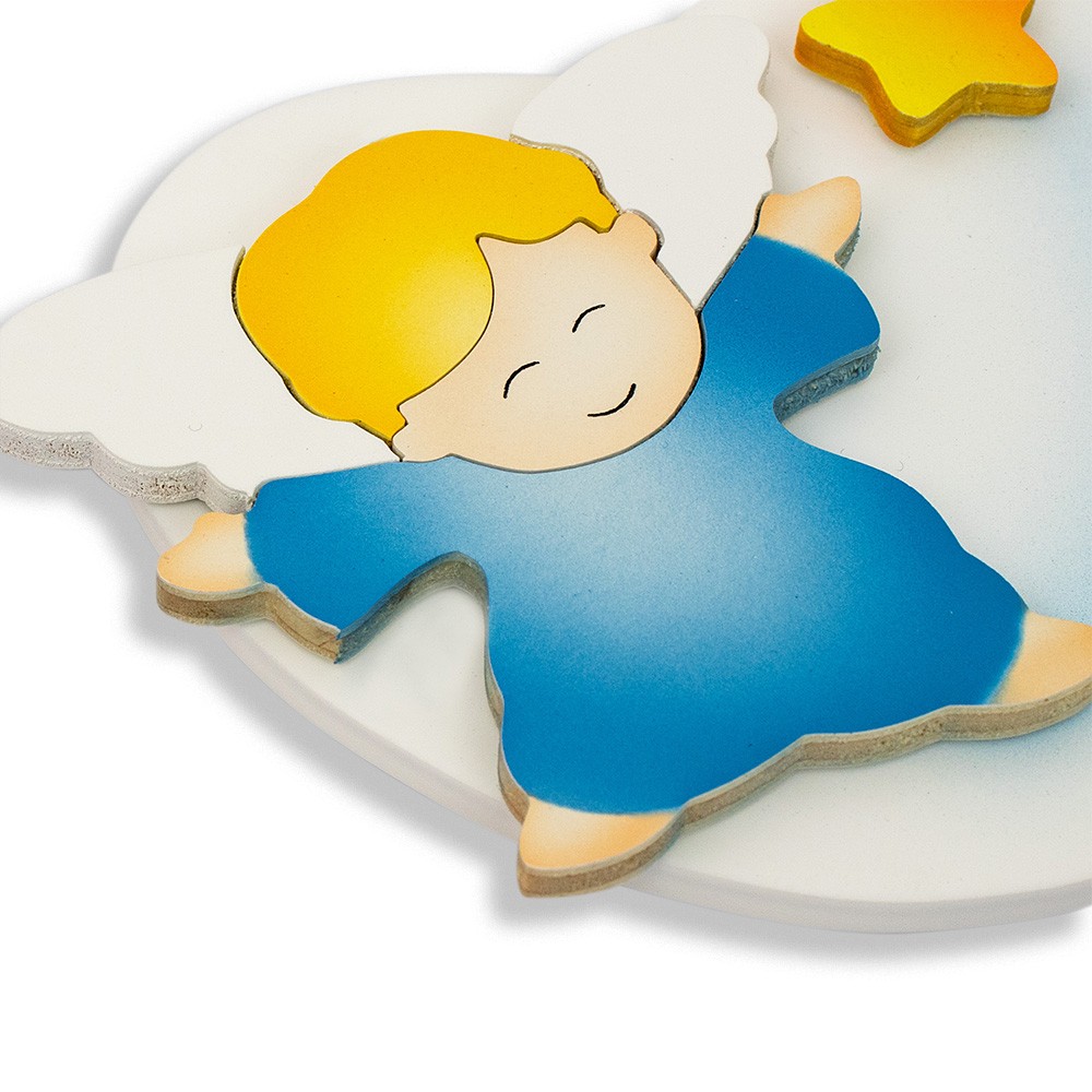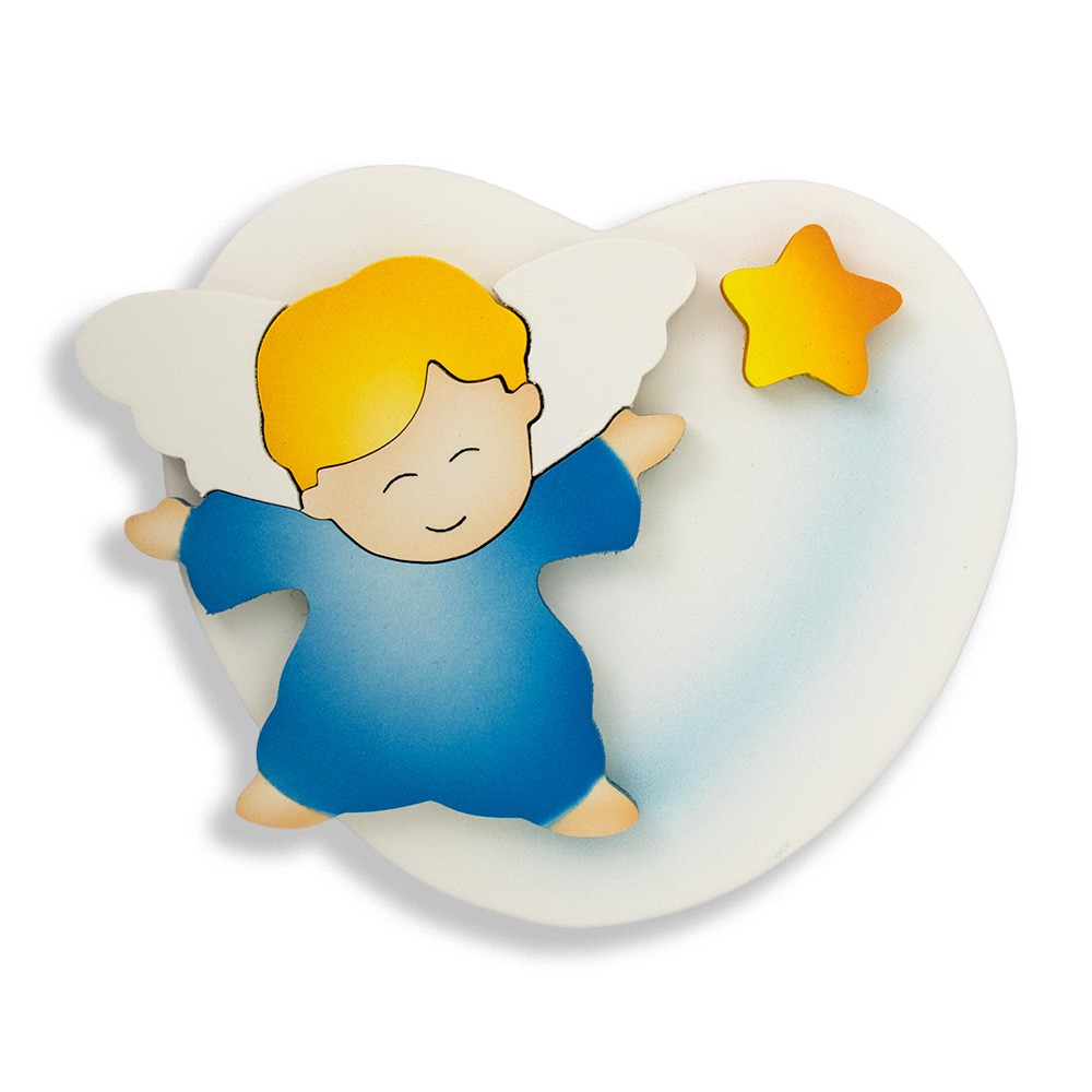 Lovely wooden picture handmade by the community of the Focolare movement in Loppiano. It depicts a white heart with an angel in a sky blue robe.