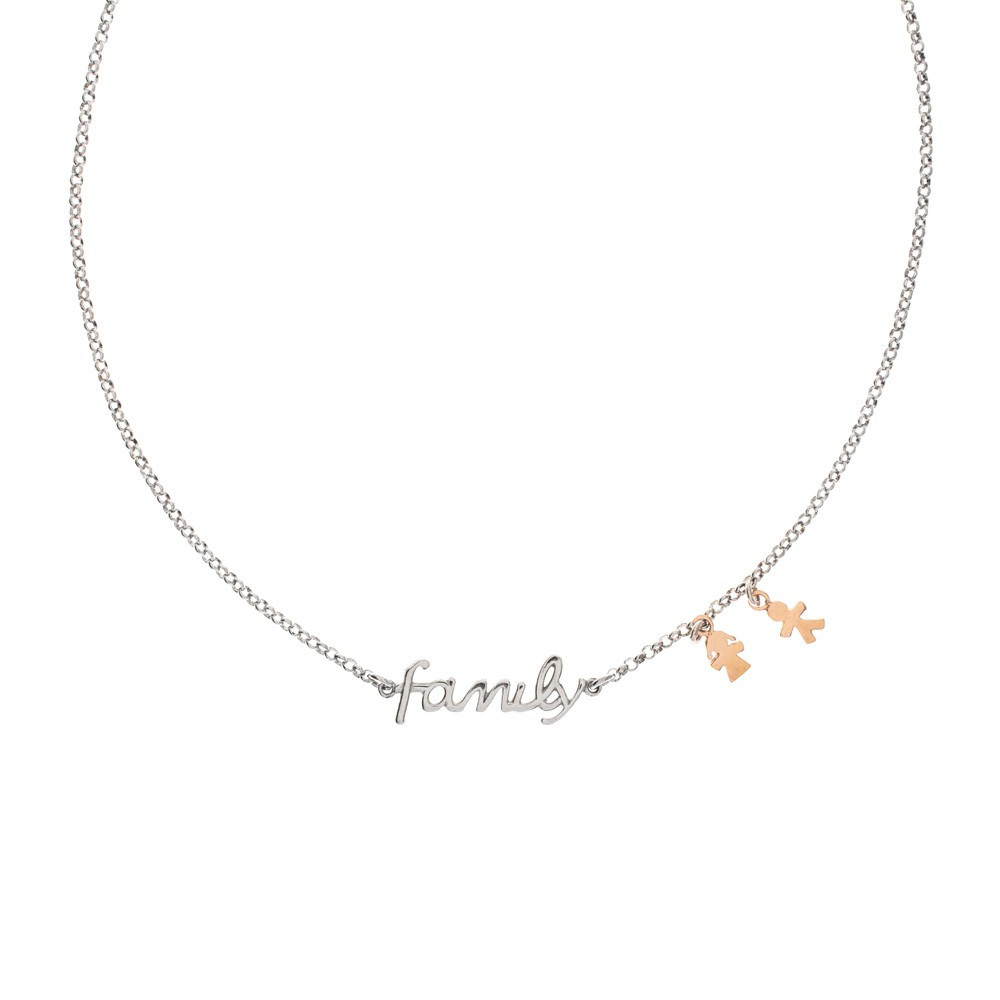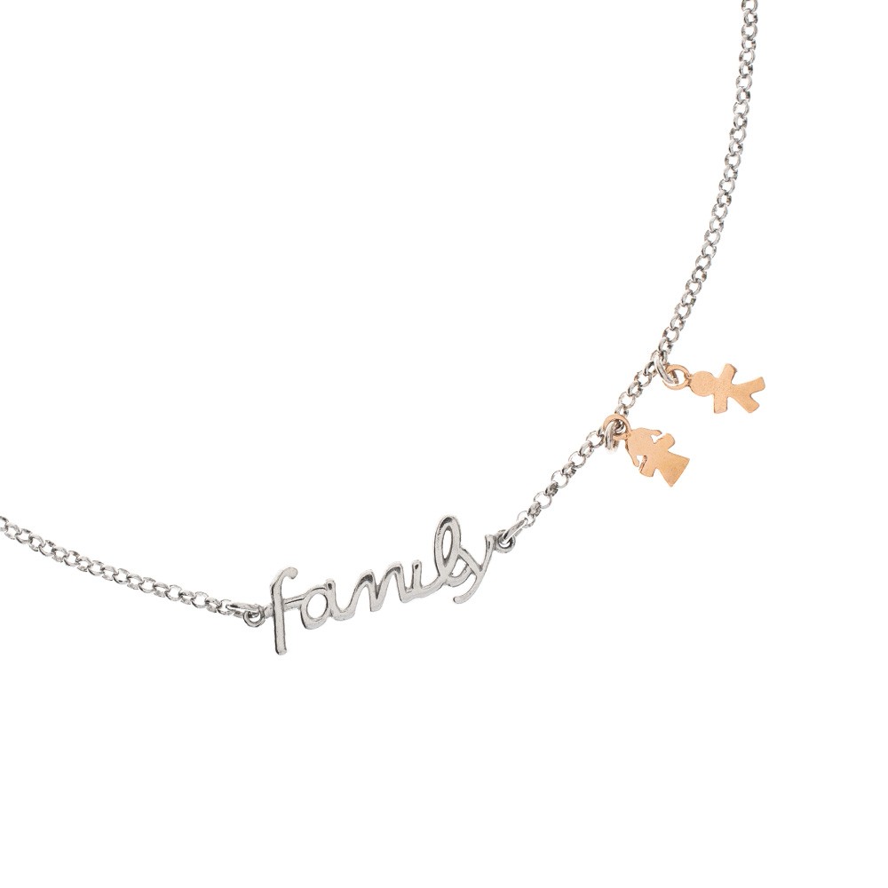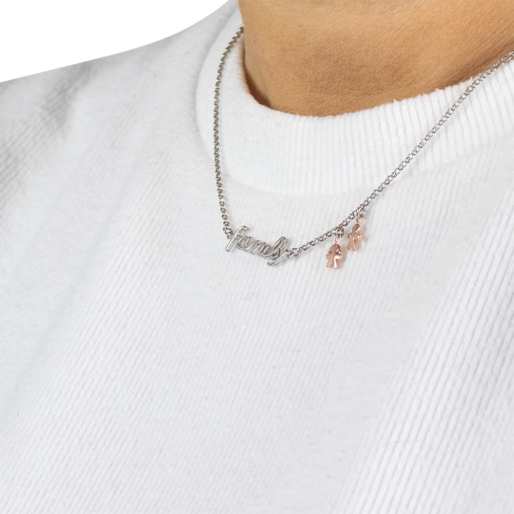 Necklace in 925 silver with Family writing and rose-plated pendants depicting two children. It is part of the “Love” collection by Amen.