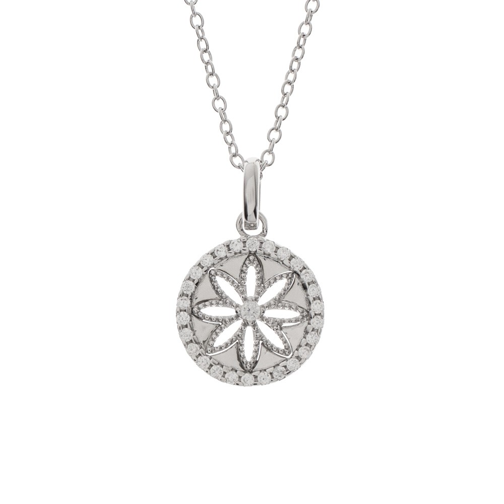 Amen necklace with round pendant of the Flower of Life in silver with white zirconias.