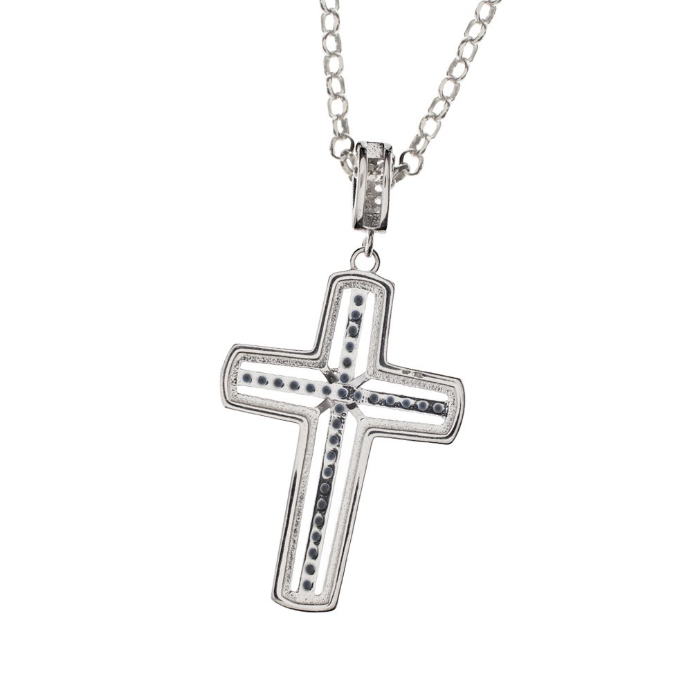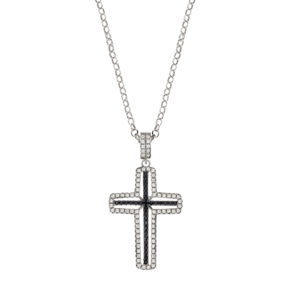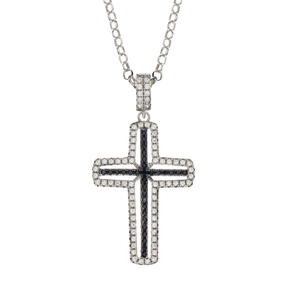 Necklace in rhodium-plated 925 silver with cross, black and white zirconias. AMEN collection.