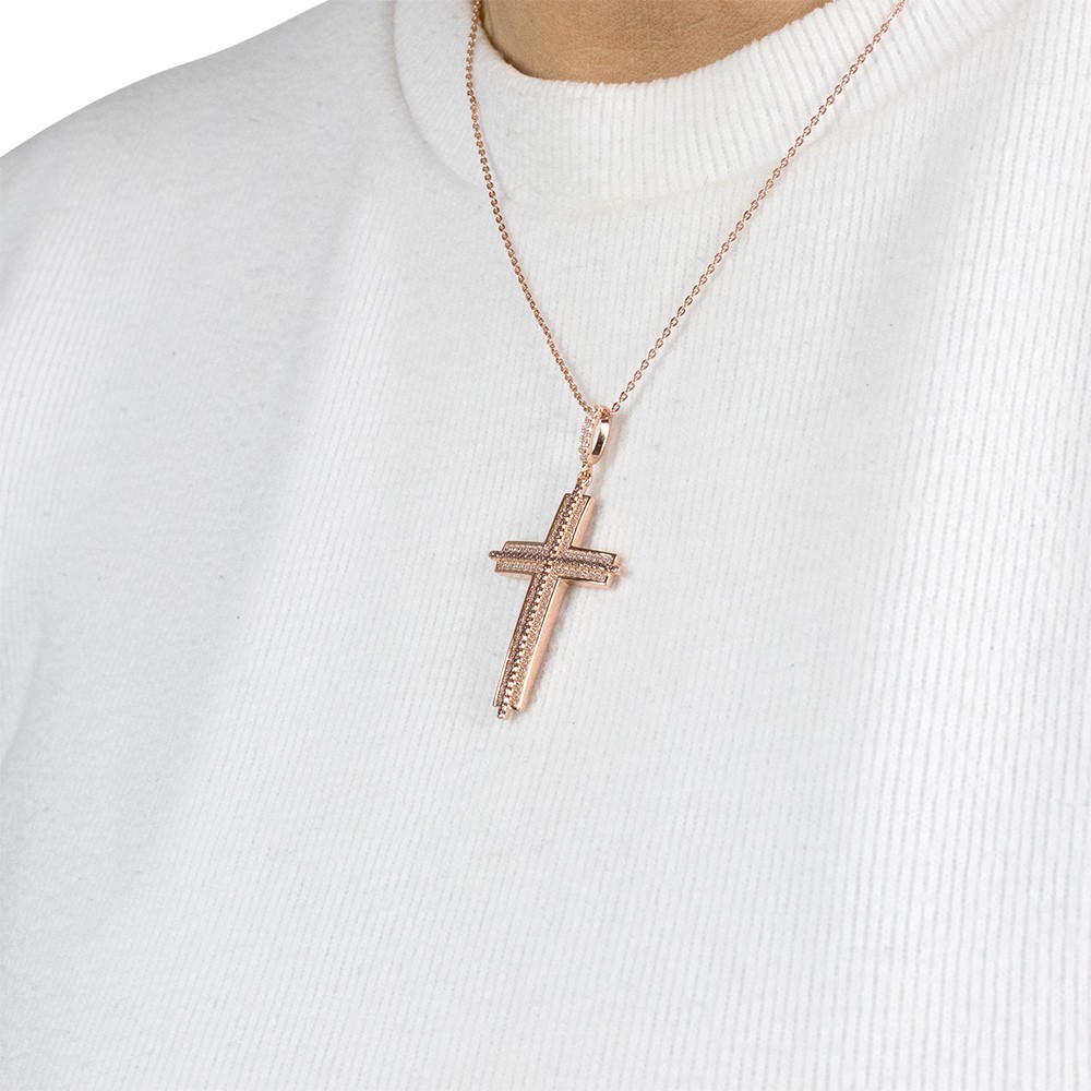Embossed cross in rose-plated silver enriched with white and brown zirconias.