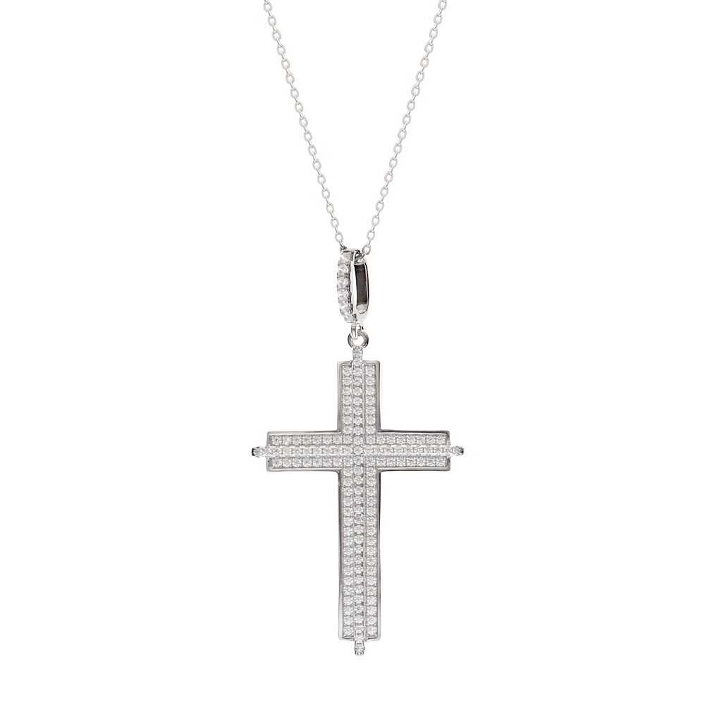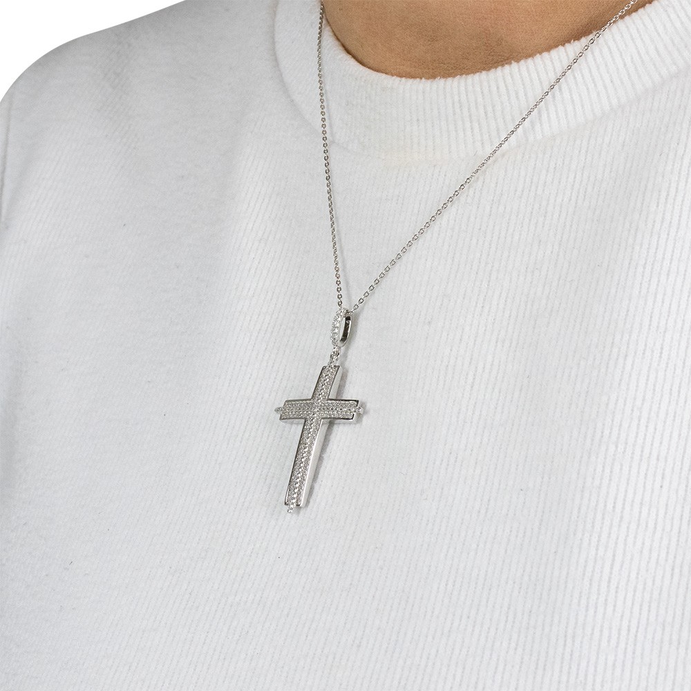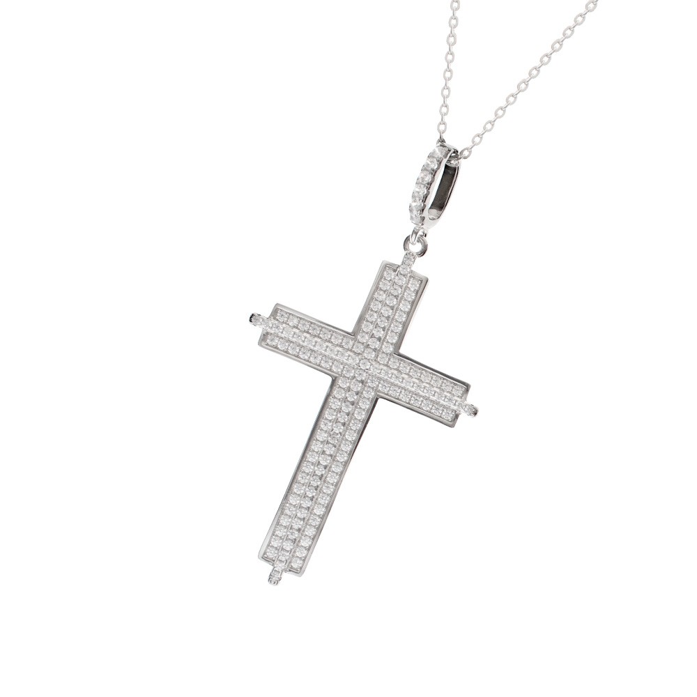 Embossed cross in rhodium-plated silver enriched with white zirconias.