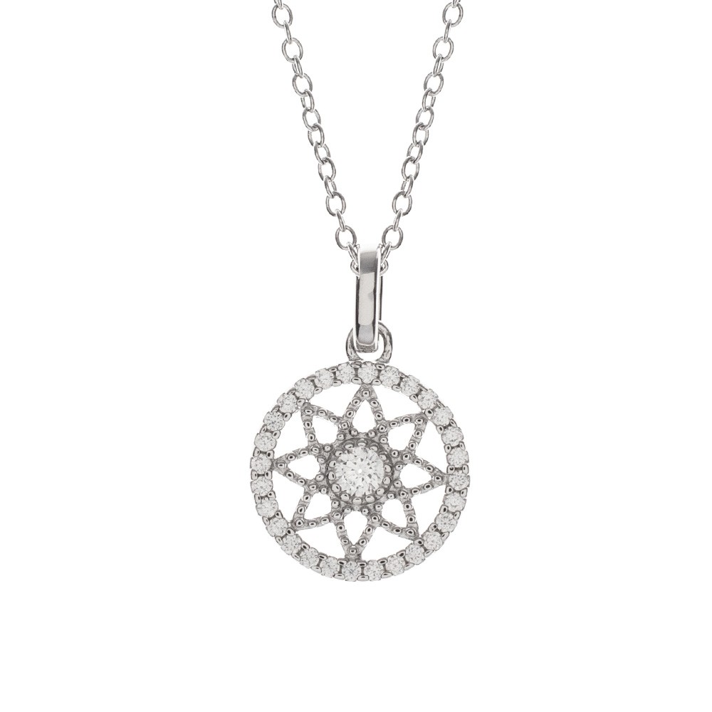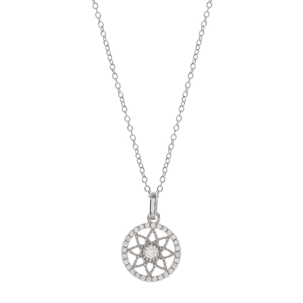 Amen necklace with round pendant of the Flower of Life in silver with white zirconias.