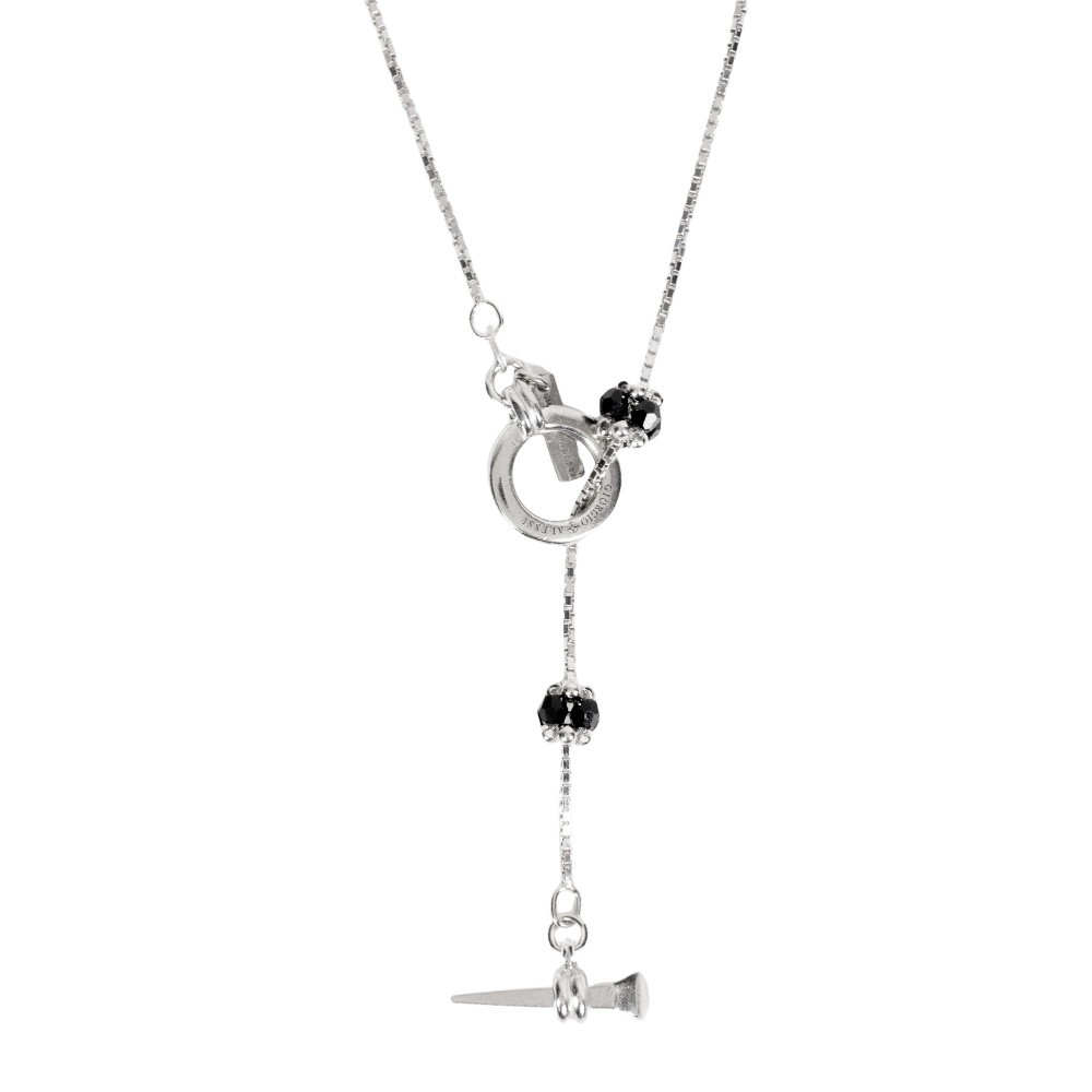 Silver necklace with nail and black beads.