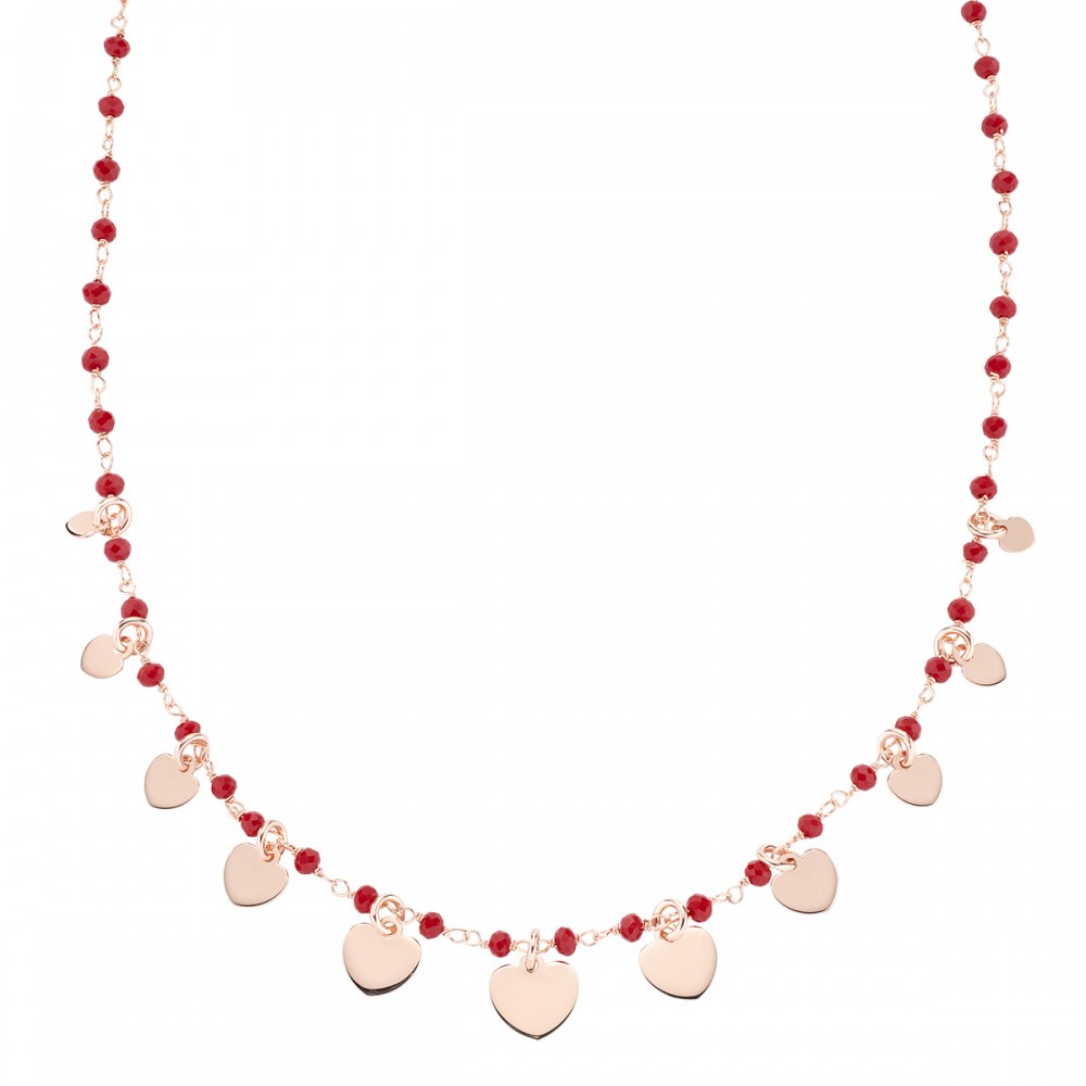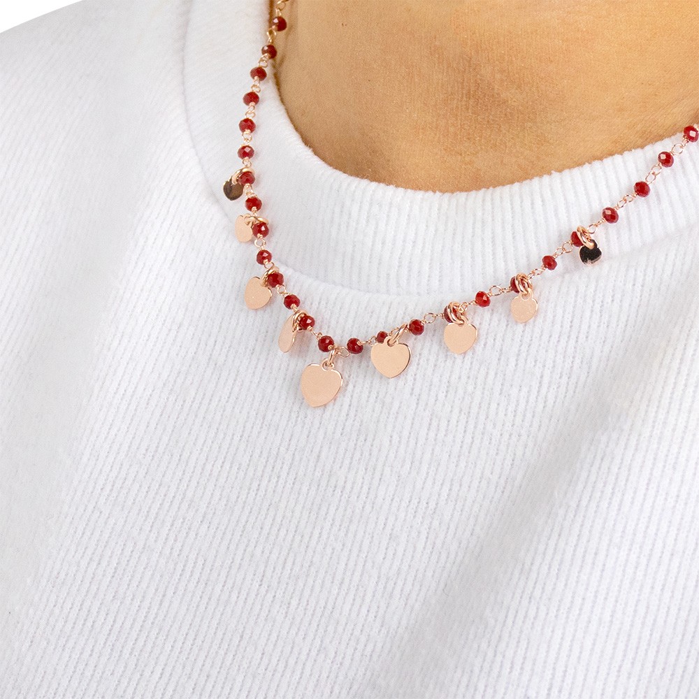 Amen Elegance Collection: necklace in rose-plated 925 silver with heart-shaped pendants and red crystals.