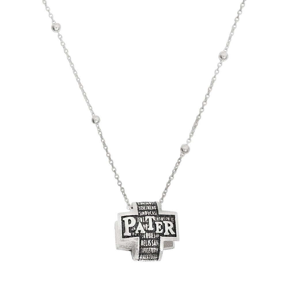 Necklace with Pater cross-shaped pendant in 925 silver with burnished rhodium finish. It features the LORD’S PRAYER engraved in Latin.