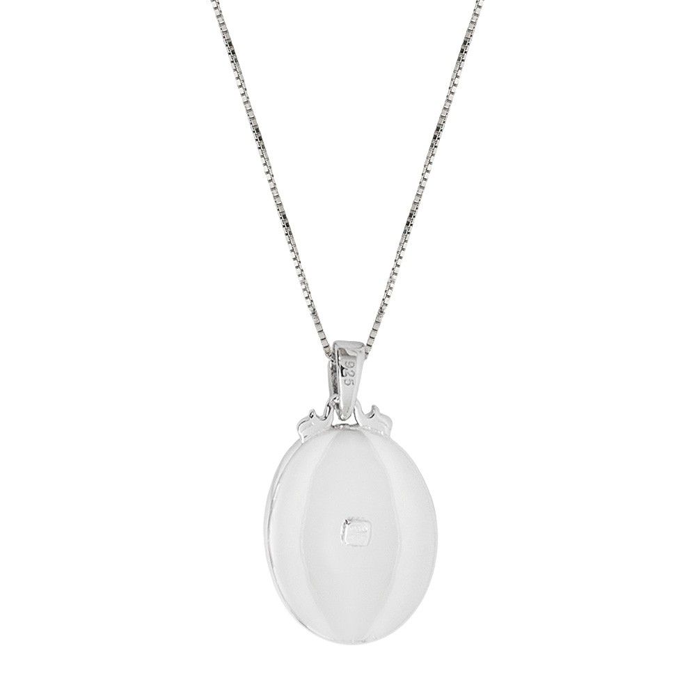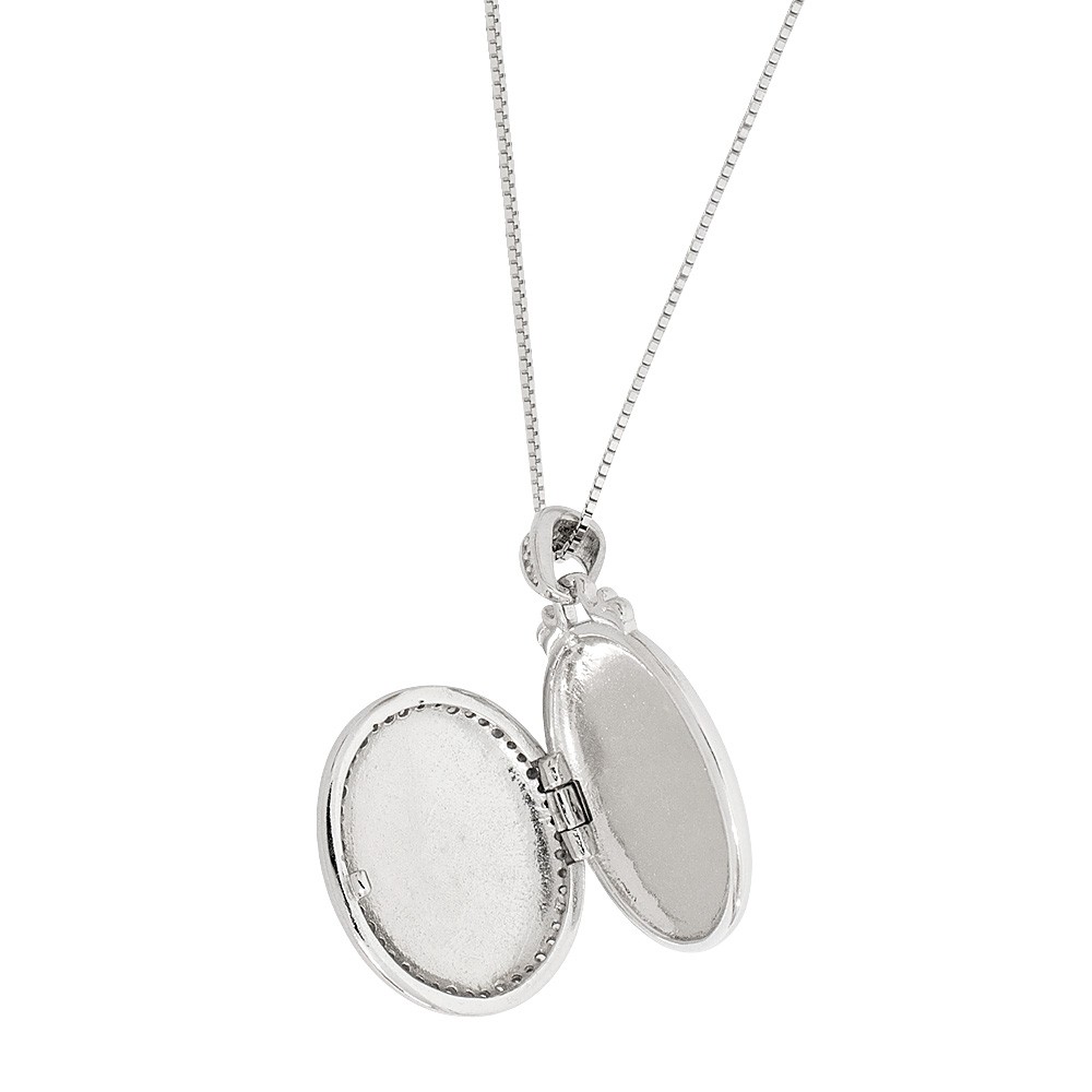Religious jewelry with oval silver locket, opens to reveal the shape of the Miraculous Virgin and sparkling zirconia.