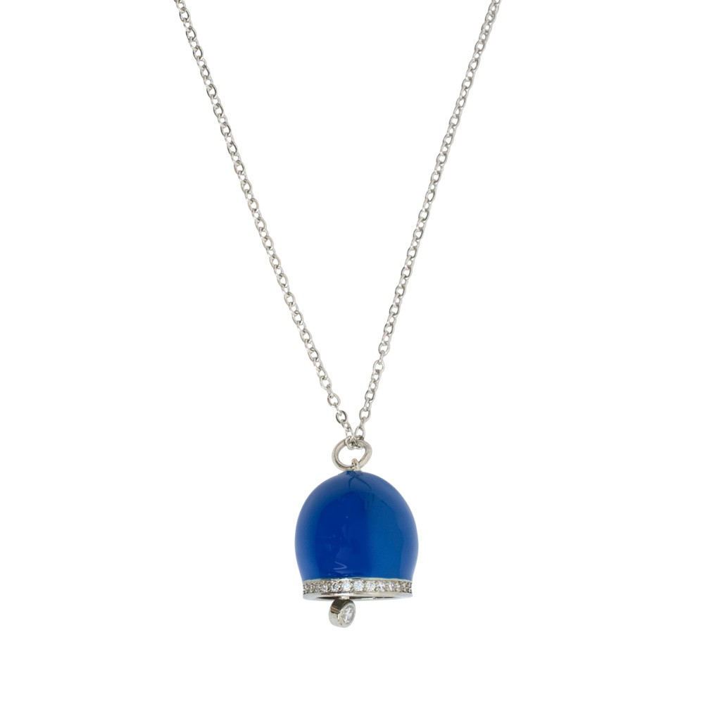 A refined and luminous piece featuring a blue enamel bell-shaped pendant, adorned with a sparkling zirconia frame. A sophisticated and radiant jewelry item, designed for everyday wear and perfect as a gift.