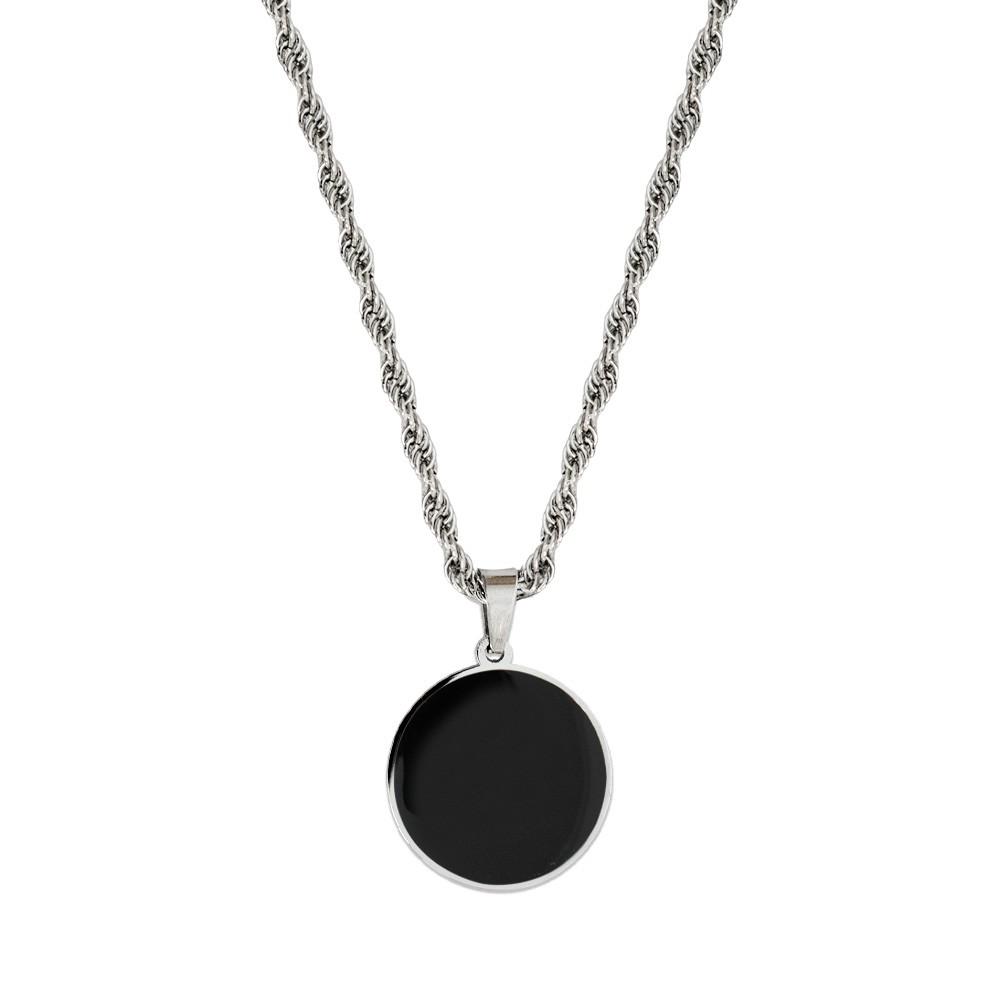 Made of durable 316L stainless steel, it holds a microchip with Joylocker® technology capable of preserving your most precious memories. The necklace features an adjustable chain, approximately 50 cm + 5 cm, and a flat round medal-shaped pendant with imprint and black enamel on the back. The clasp is a lobster claw.