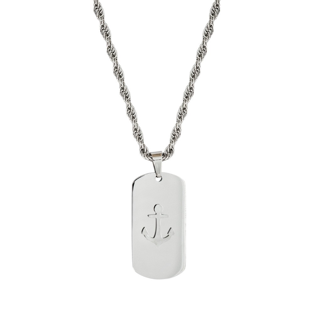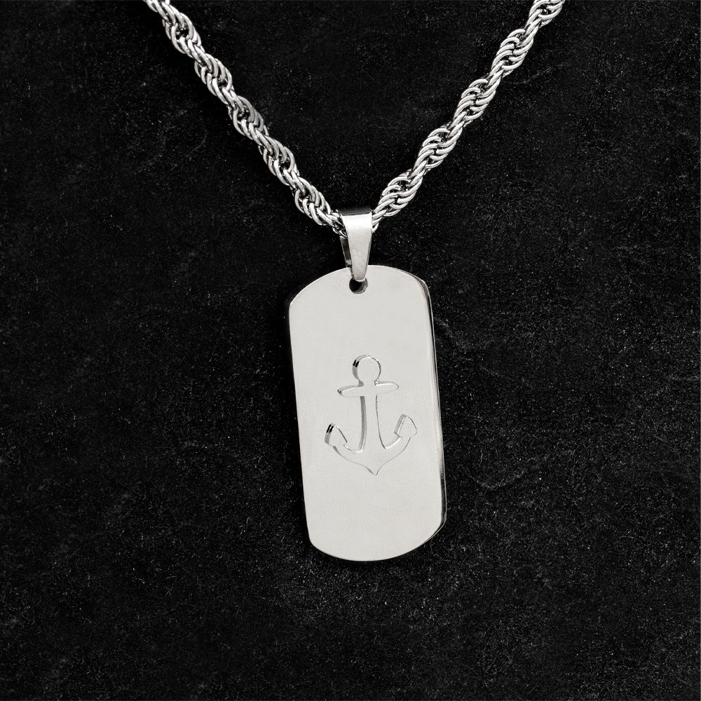 Made of durable 316L stainless steel, the necklace holds a microchip with Joylocker® technology, designed to preserve your most precious moments. It features an adjustable chain, approximately 50 cm + 5 cm, and a flat plate-shaped pendant with a raised anchor, imprint, and black enamel on the back. The clasp is a lobster claw.