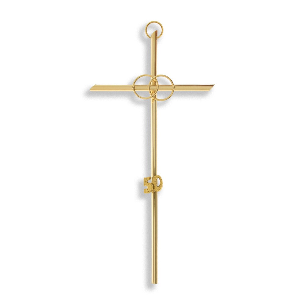 Stylized cross in modern style. Made of golden-colored metal with two intertwined wedding rings and the number 50 at the bottom.