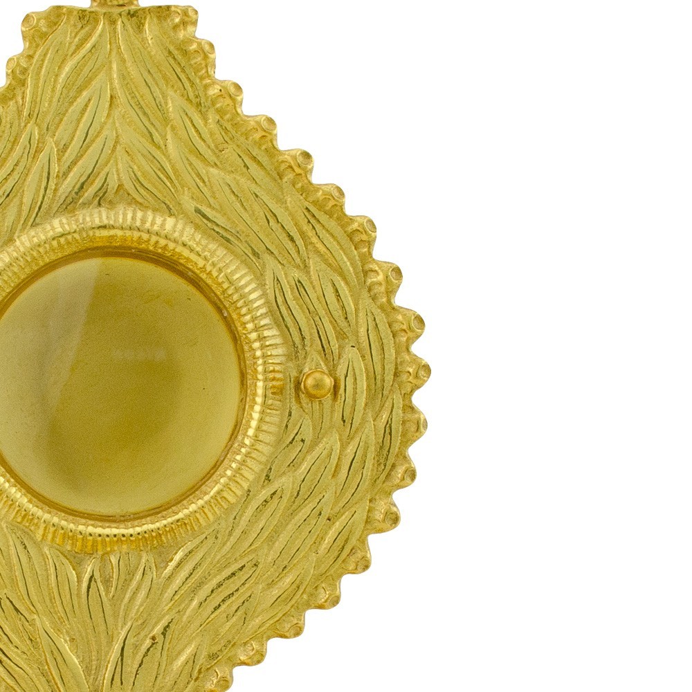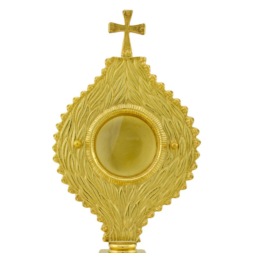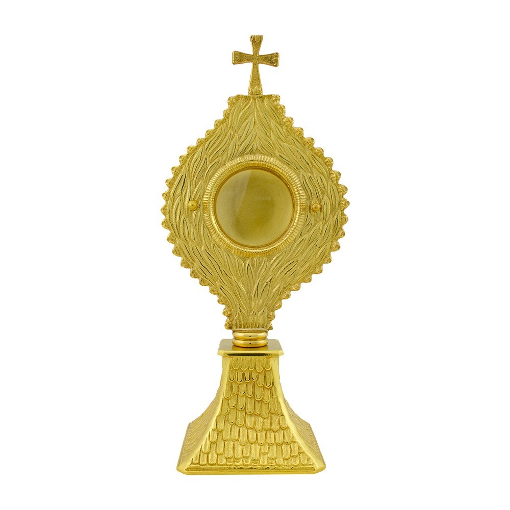 Reliquary made of cast brass with gold finish. This reliquary is 27 cm tall and its shrine has a diameter of 6 cm. The cross is finely decorated with olive tree branches.