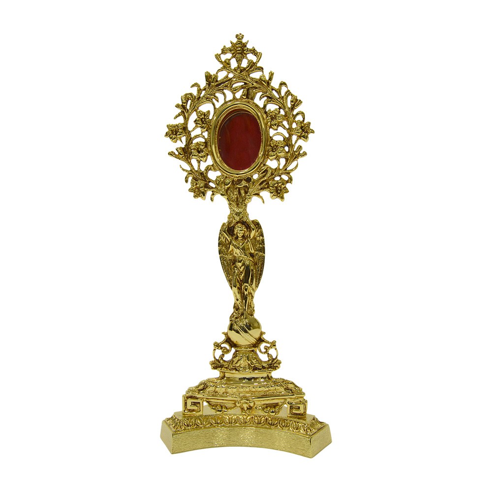 Reliquary in gold plated brass with angel and flowers decoration, h 41 cm.