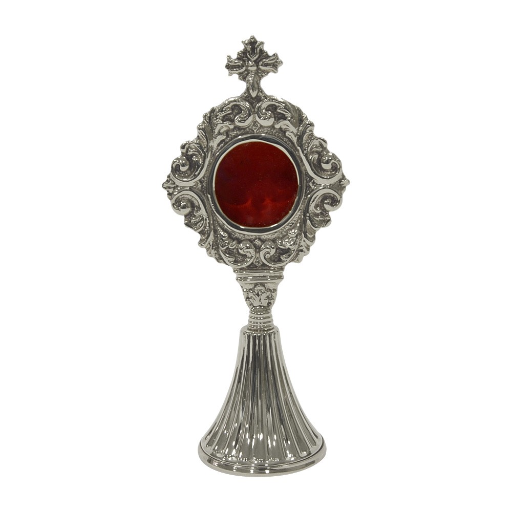 Reliquary in silver-plated brass with angels decoration, h 34 cm. Shrine diameter: 6 cm.