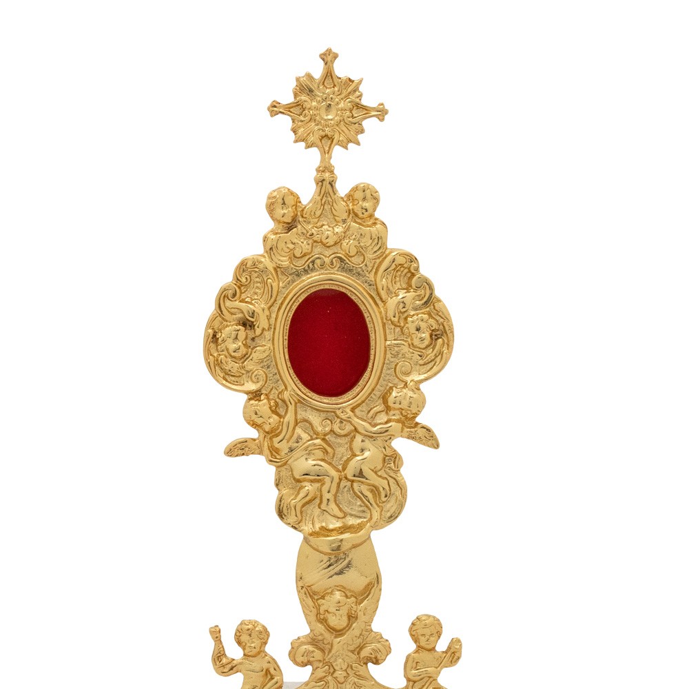Reliquary with angels decoration. Made of brass in gold finish.