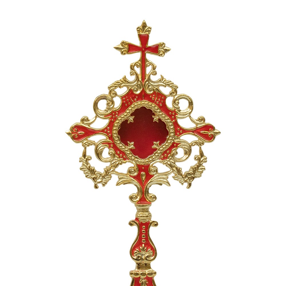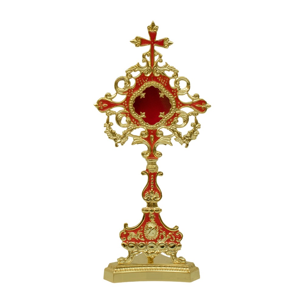 This reliquary is made of gold-plated brass and enriched with red enamel.
