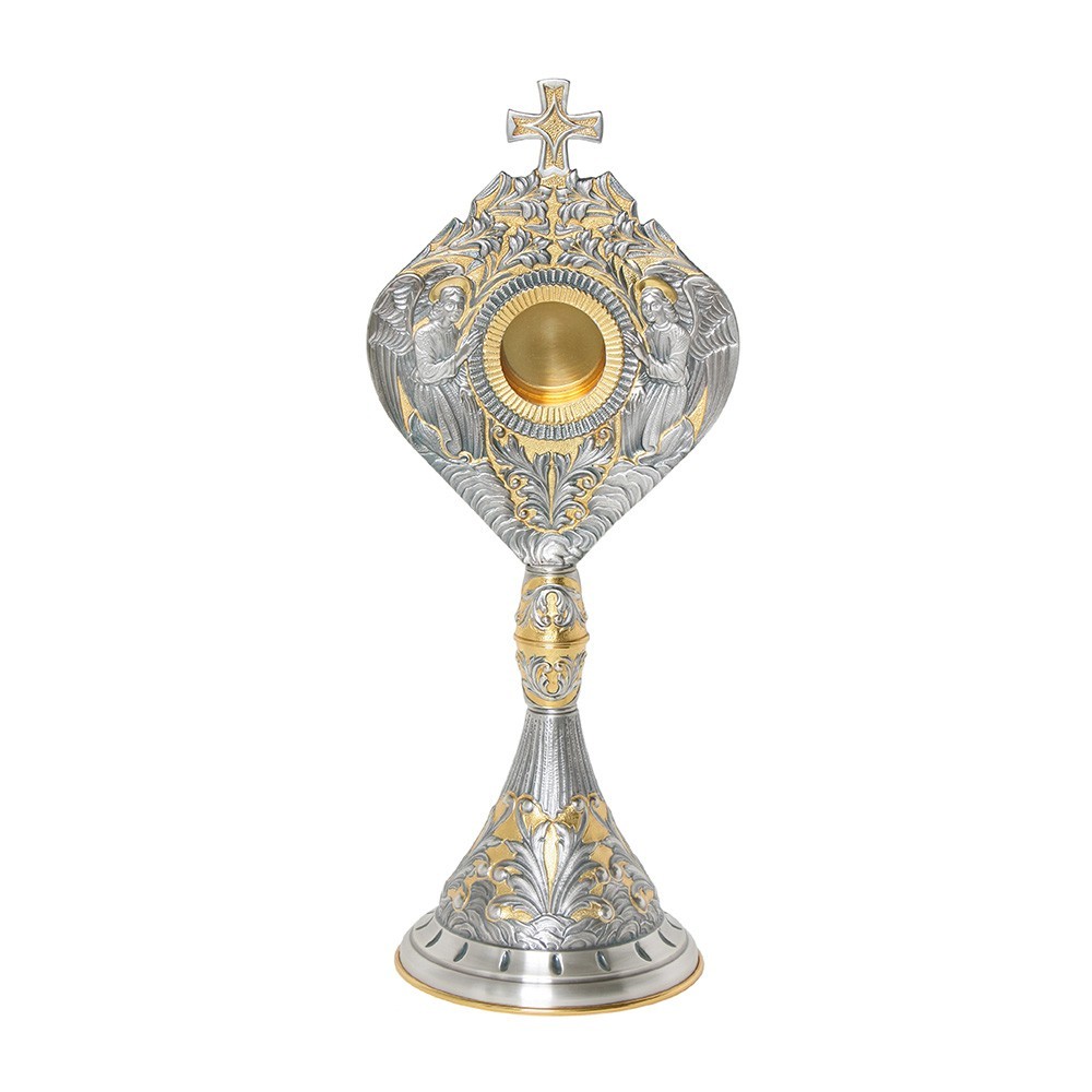 Elegant reliquary finely decorated by hand. Material: brass in gold and silver finish. This reliquary is 54 cm tall and its shrine has a diameter of 21.5 cm. Made by an Italian company with dozens of years of experience in the manufacturing of church furnishings.