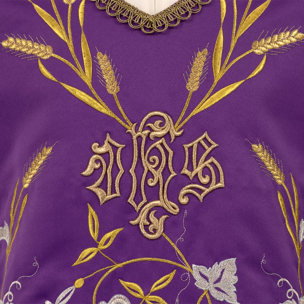 This elegant Roman chasuble features floral embroideries and the JHS symbol in the middle. The embroidery is applied on both front and back and is made using golden and colored threads.