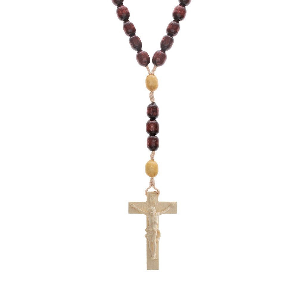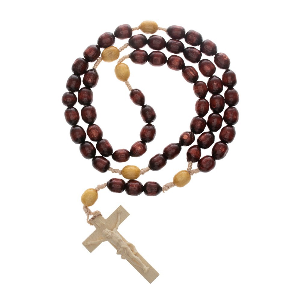 Handcrafted rosary with oval grains in brown wood bound with rope and crucifix in natural wood.