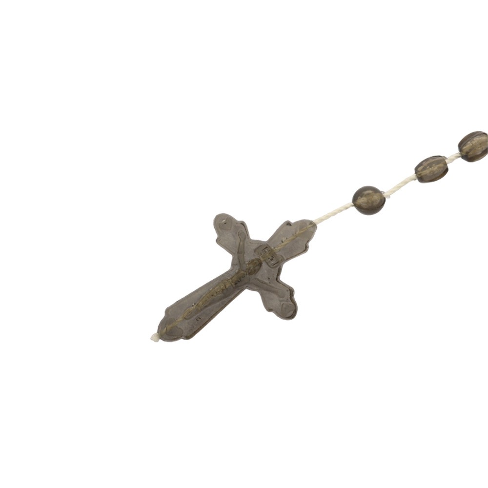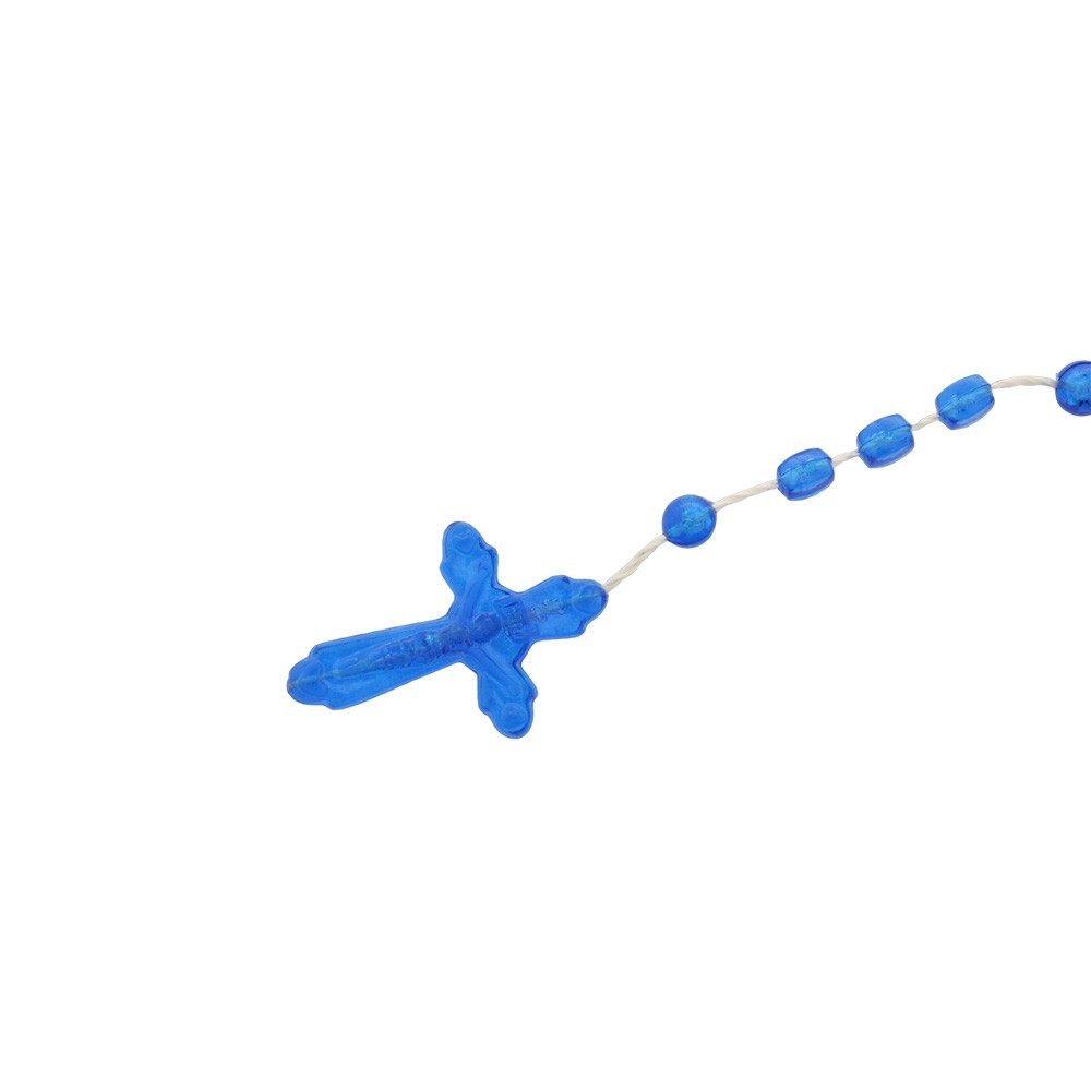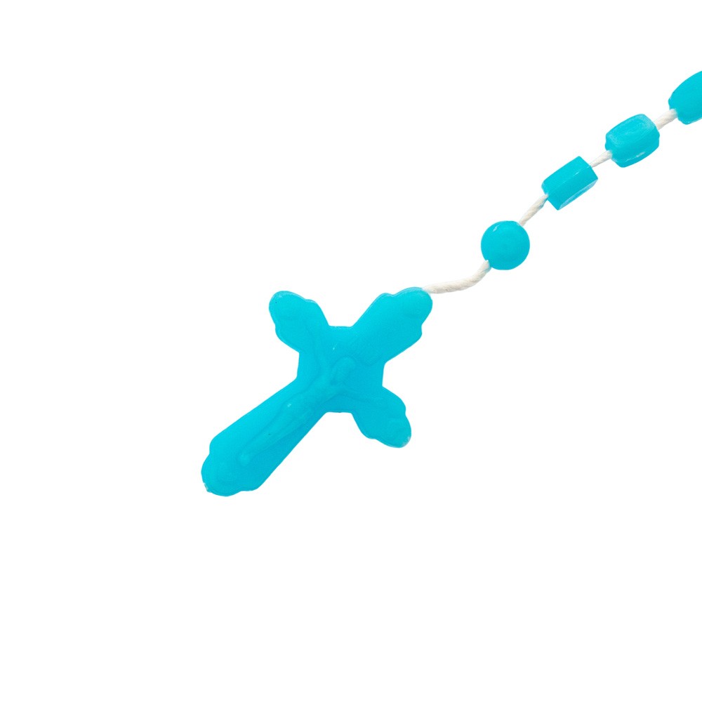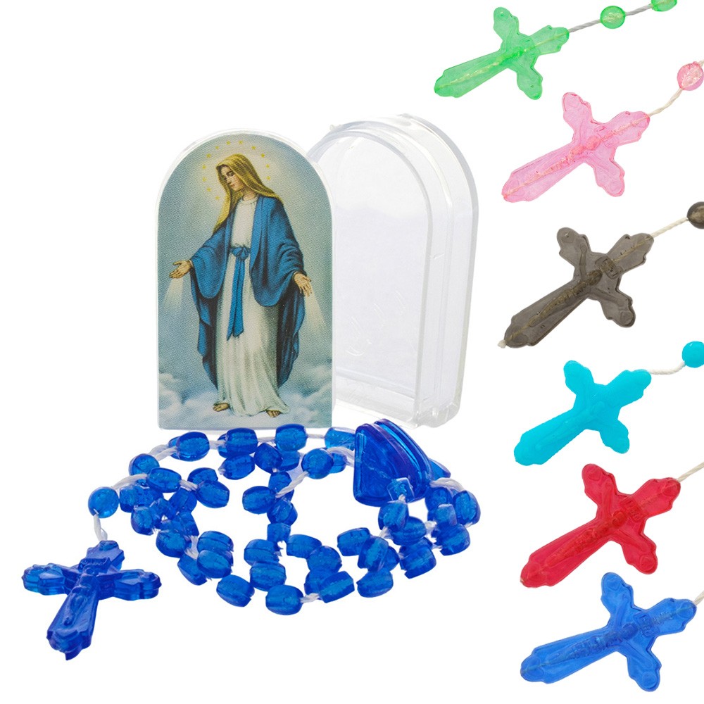 Neck rosary in colored plastic. It can also be worn thanks to the centerpiece that can be opened (look at the image).