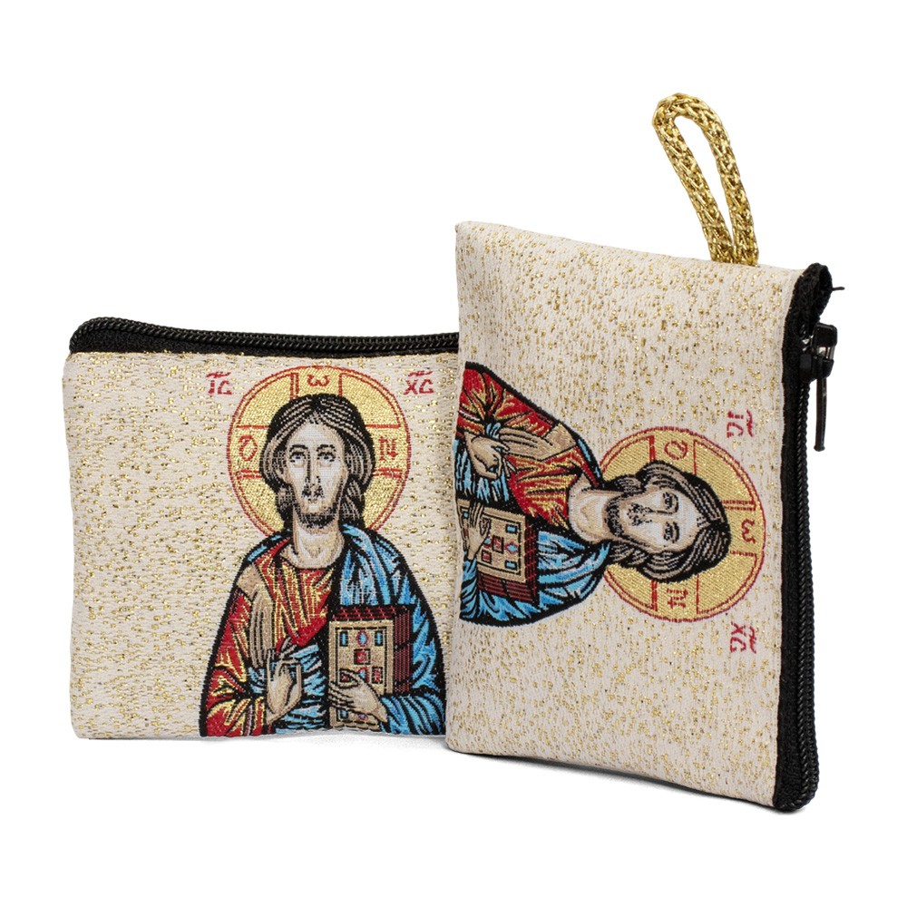 Rosary pouch in the shape of a small bag featuring an image of Jesus Pantocrator.