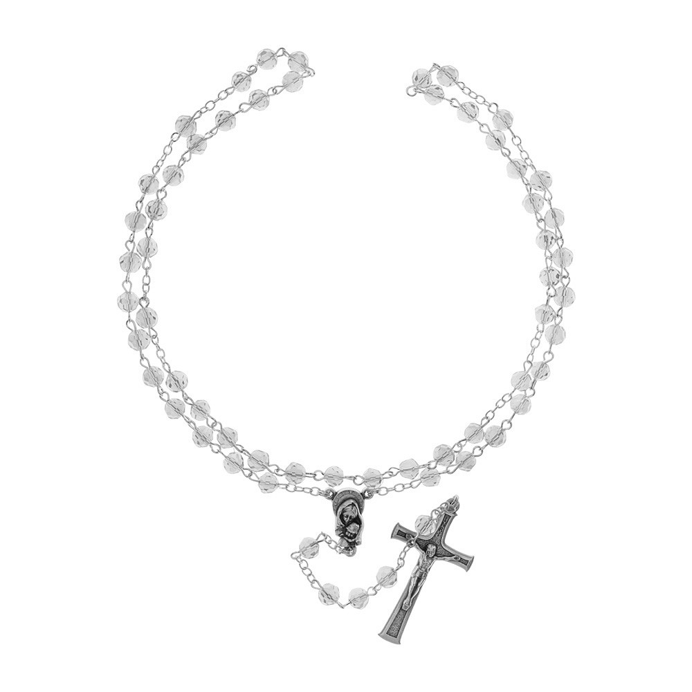 Rosary with grains in clear faceted crystal, tied together by a chain in silver metal.