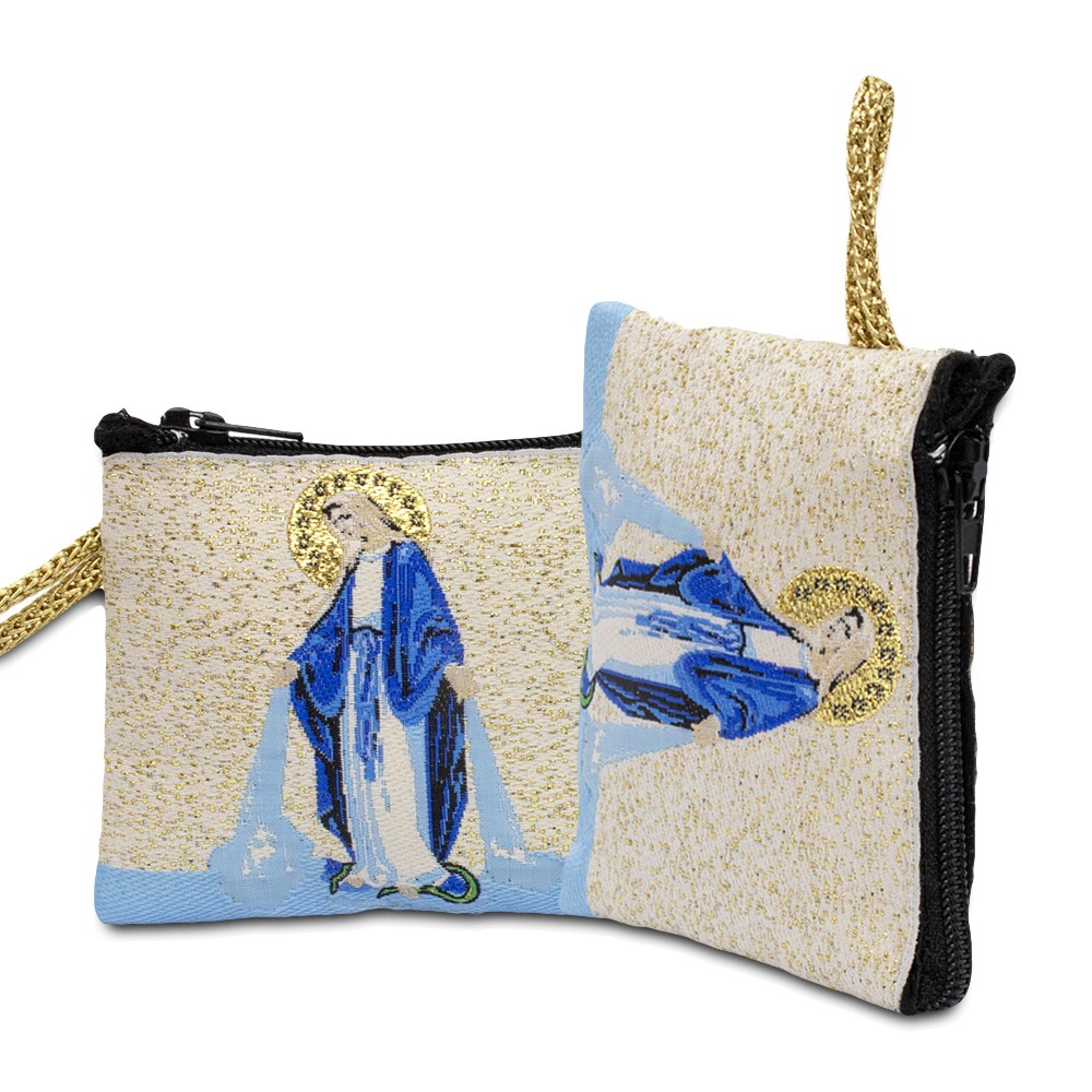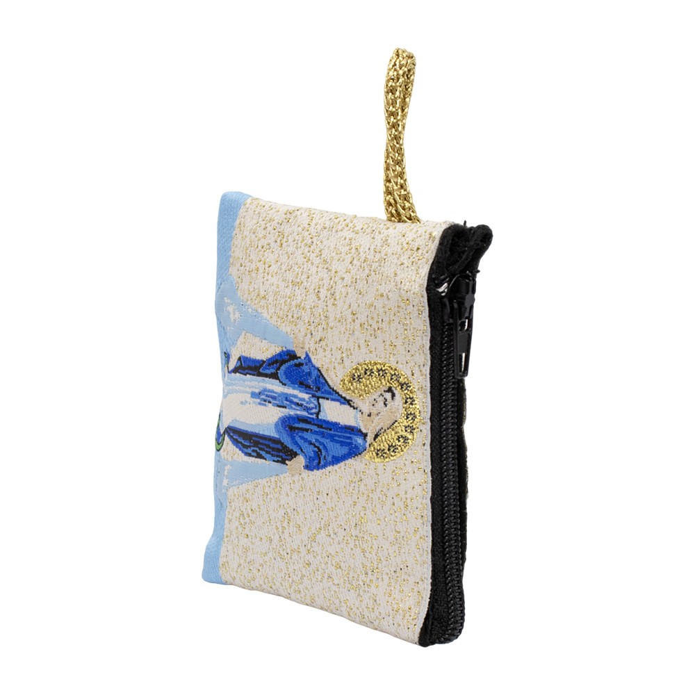 Small rosary purse in fabric with depicted image of Miraculous Mary.