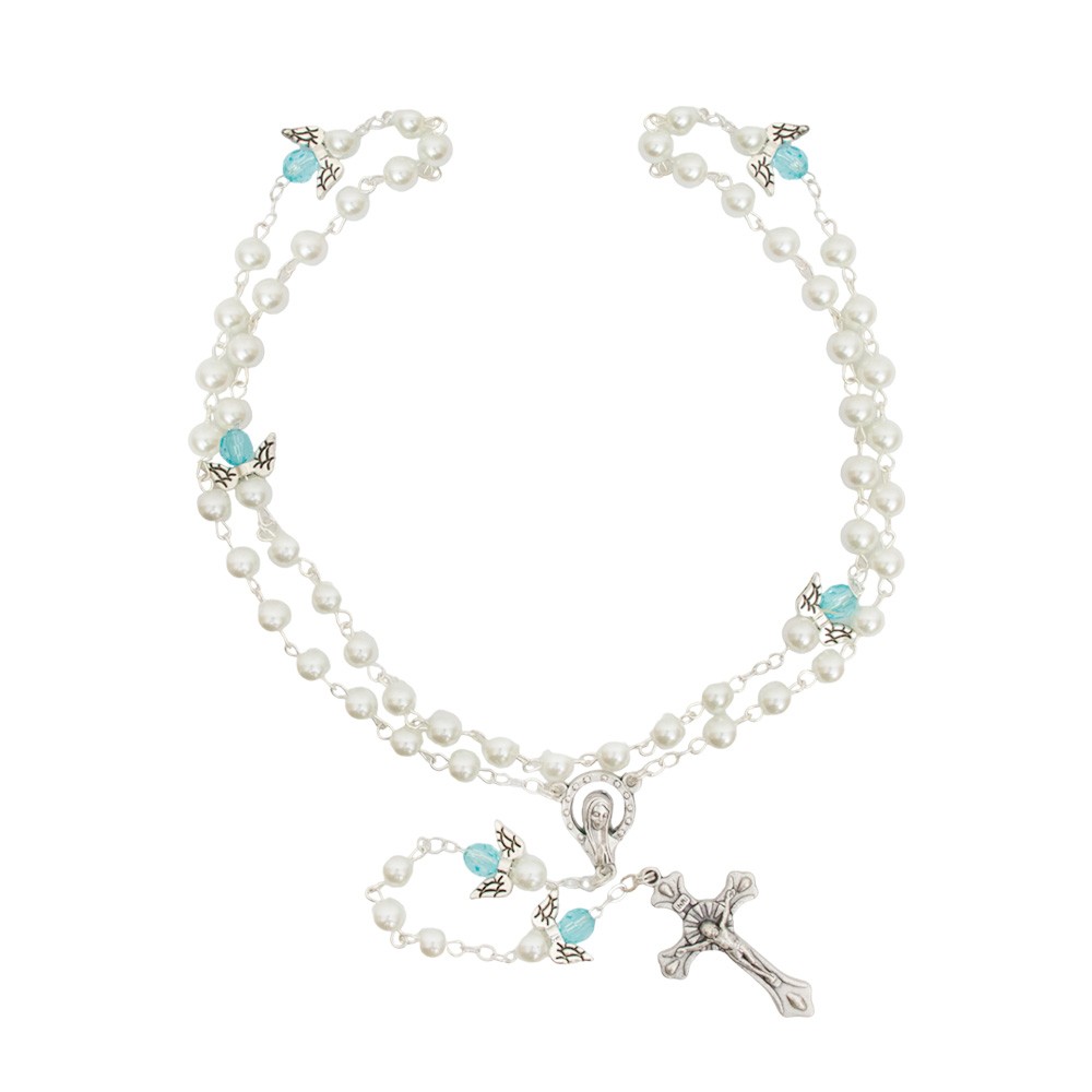 This charming box measures 6x8 cm and features a raised angel design with a light blue robe. Inside is a wearable rosary with round beads in white and light blue faux pearl.