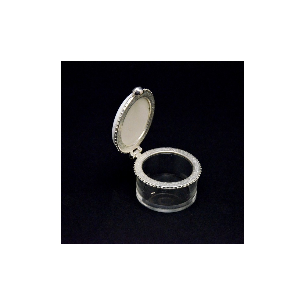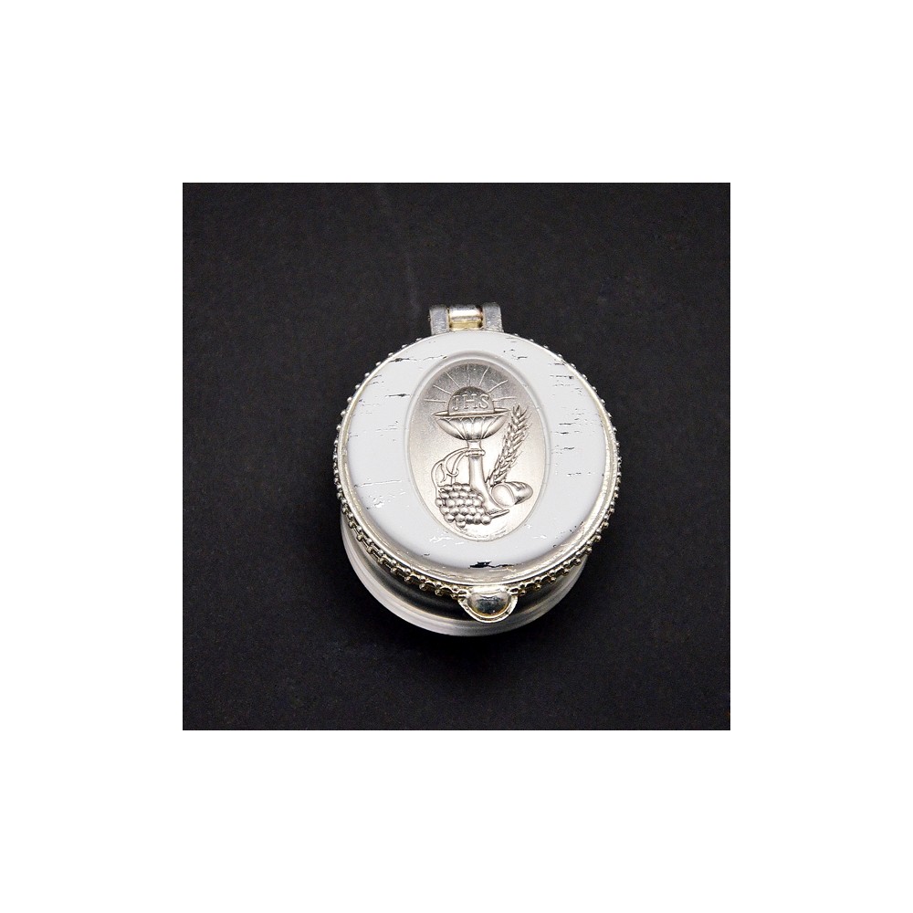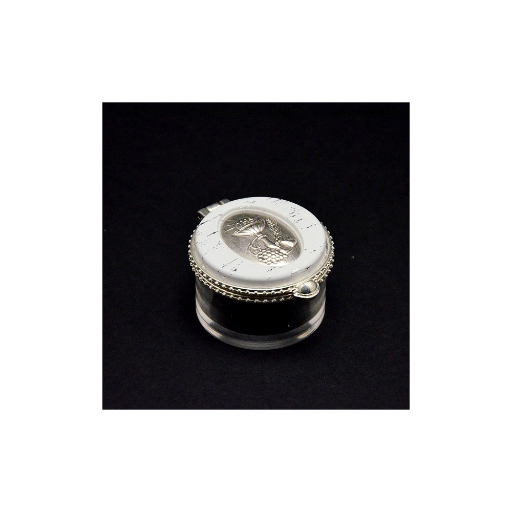 Elegant rosary box in rigid plastic with plaque in silver metal with symbols of the First Communion. The plaque depicts the image of Chalice, ear of wheat, grapes and bread. Suitable for rosaries with small-sized grains. This light and useful can also serve as a bonbonnière or favor for First Communion.