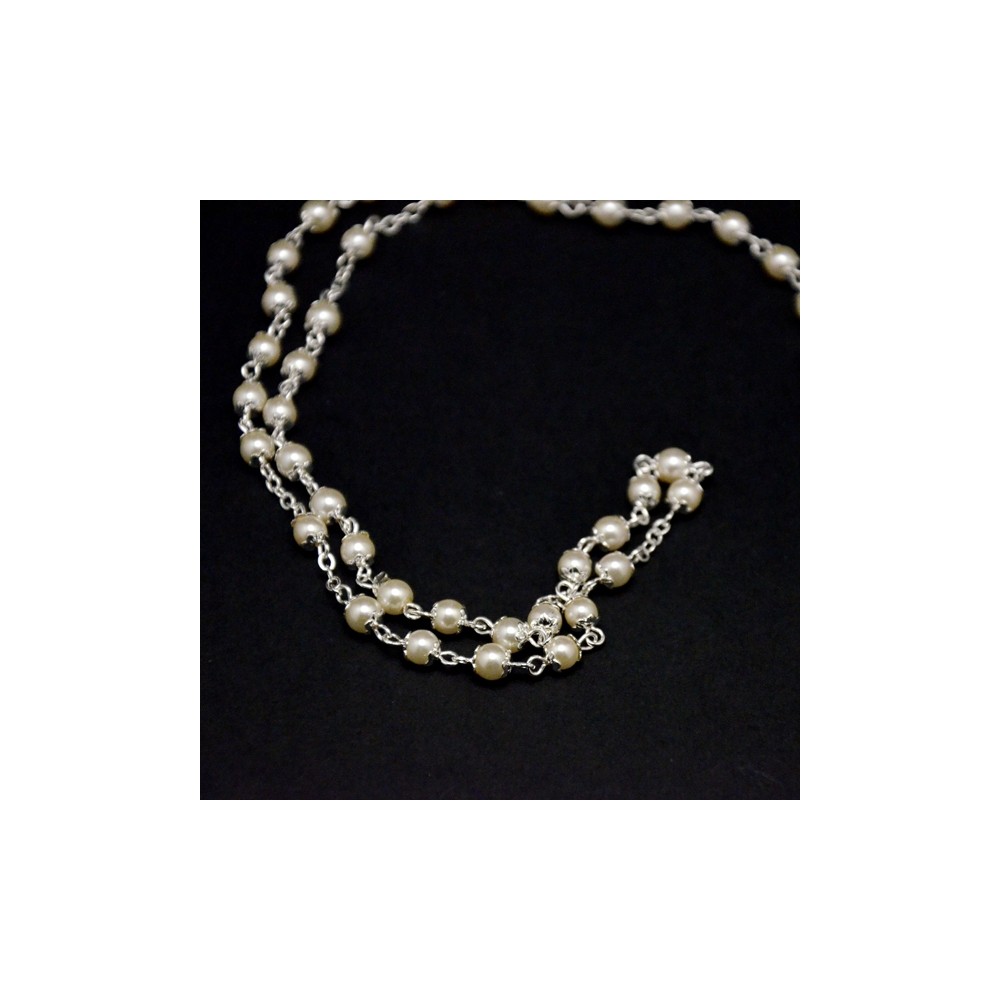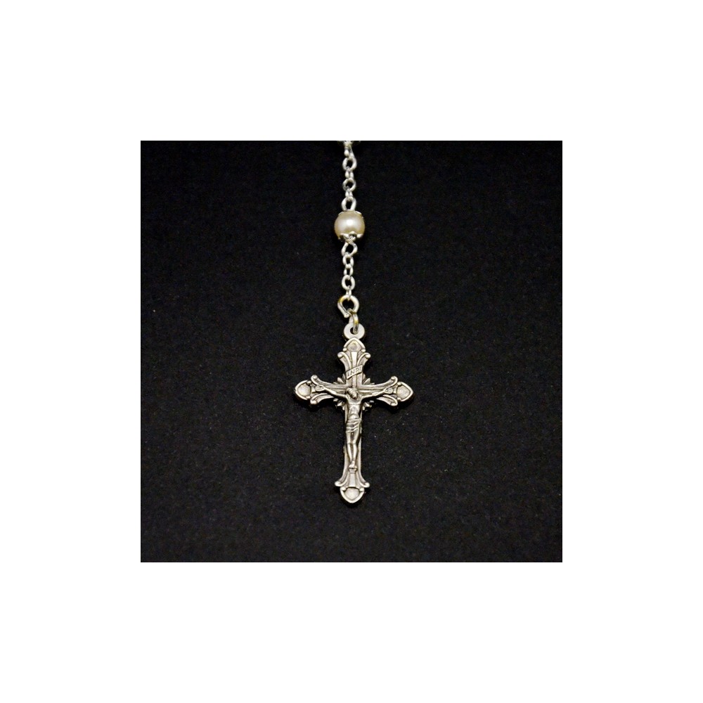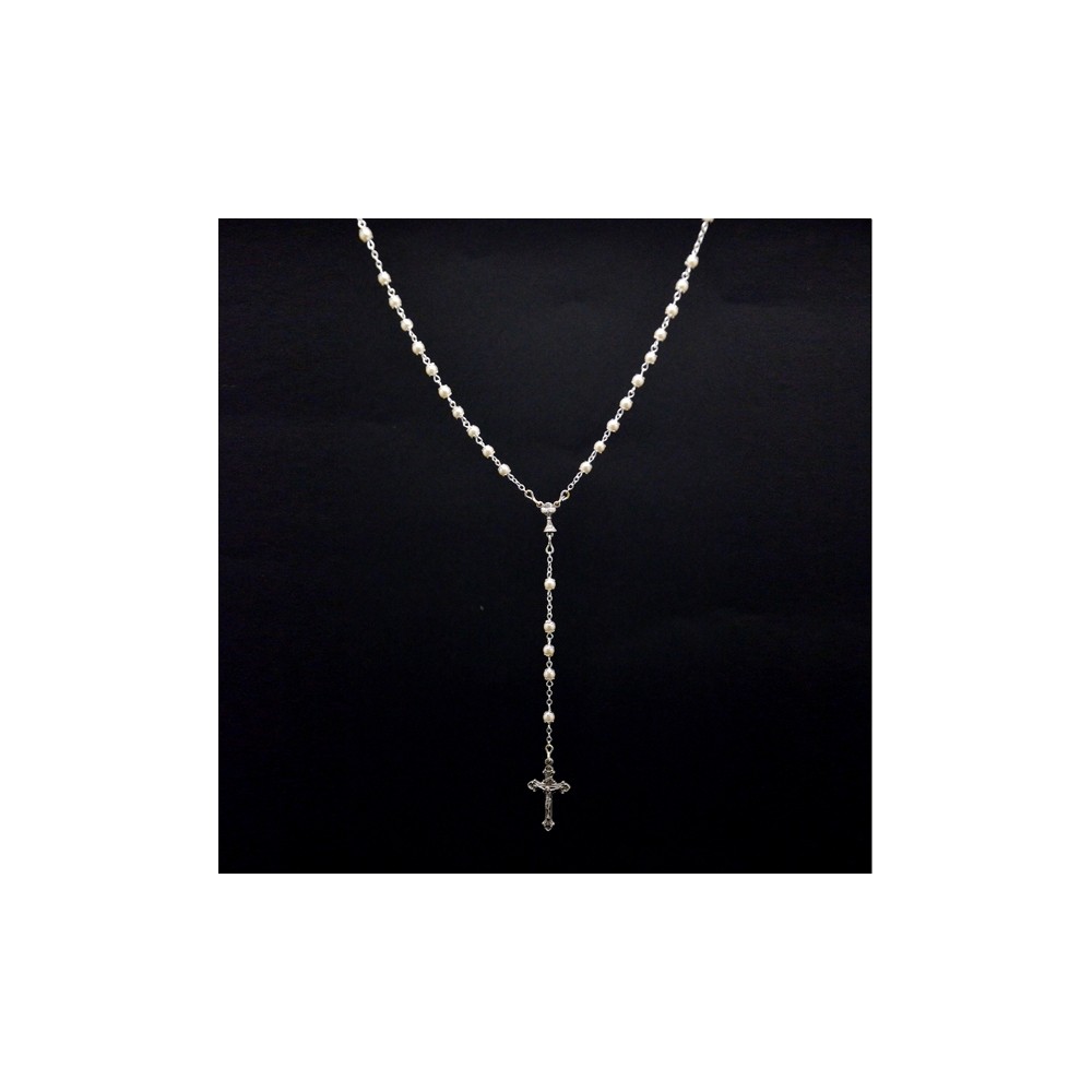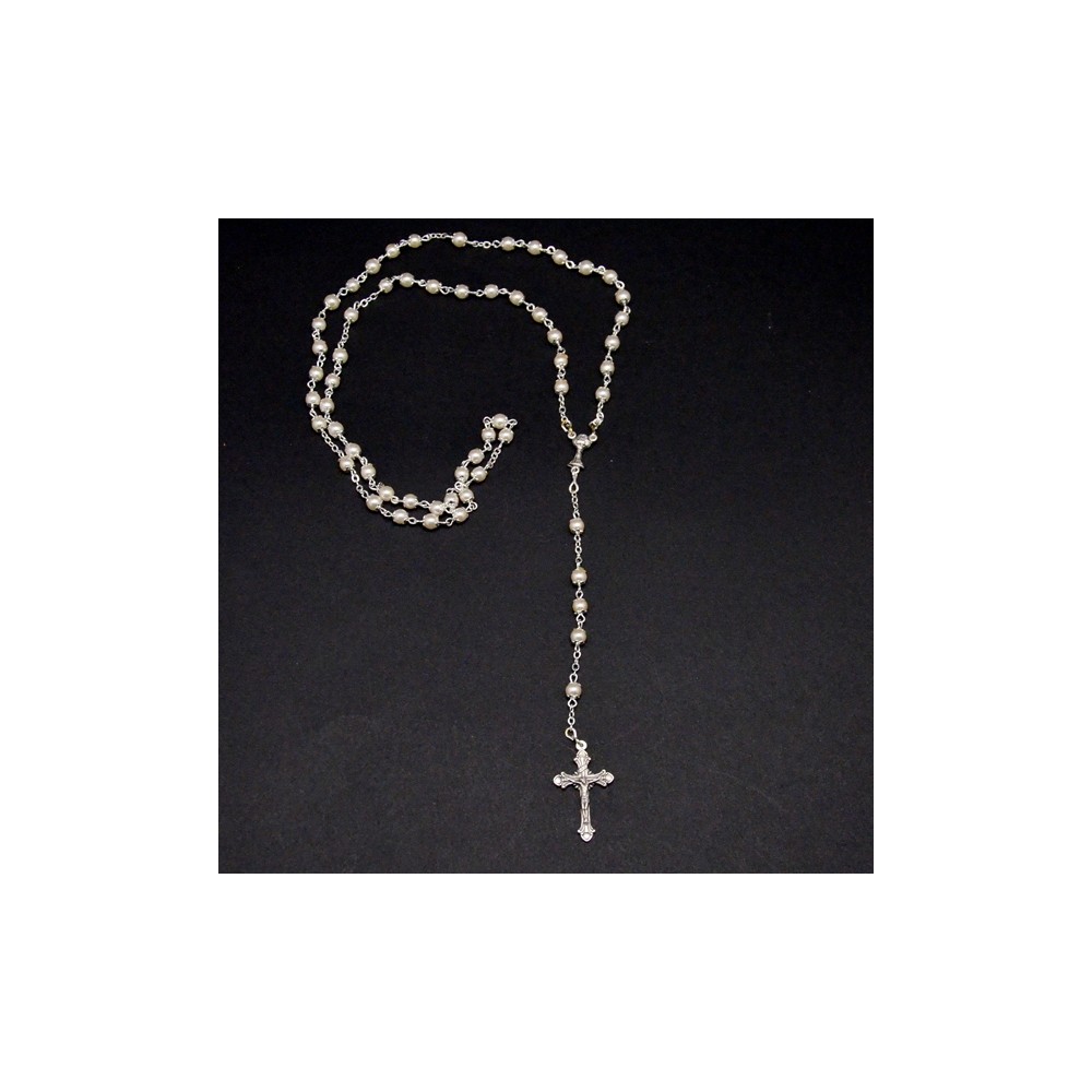 Rosary beads with round grains (5 mm diameter) in semi-pearl with metal cotters. The centerpiece depicts chalice and host. Binding, crucifix and centerpiece are made of silver metal. Made in Italy. Lovely idea for First Communion favors and bonbonbonnières.