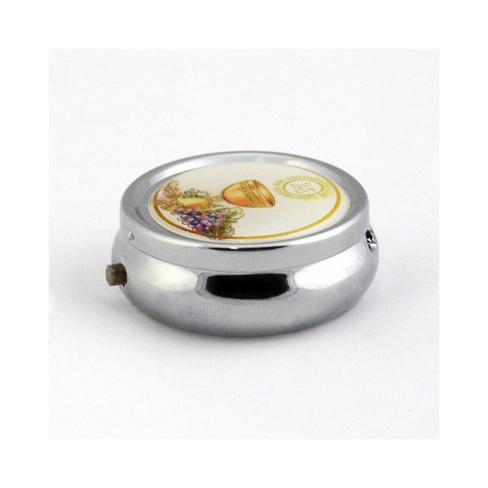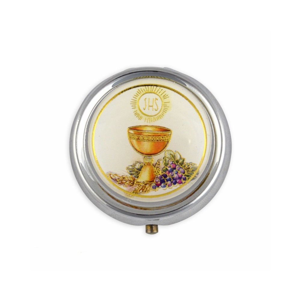 Small rosary box of round shape, made of silver colored plastic. The box depicts the image of Chalice, ear of wheat and bunch of grapes. These are all symbols of the First Communion.