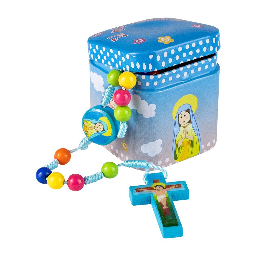 Tin box containing a colorful rosary for children.