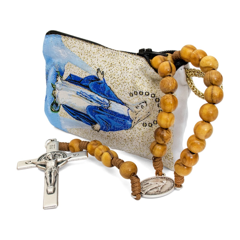 Small rosary purse in fabric with depicted image of Our Lady Of Miracles.