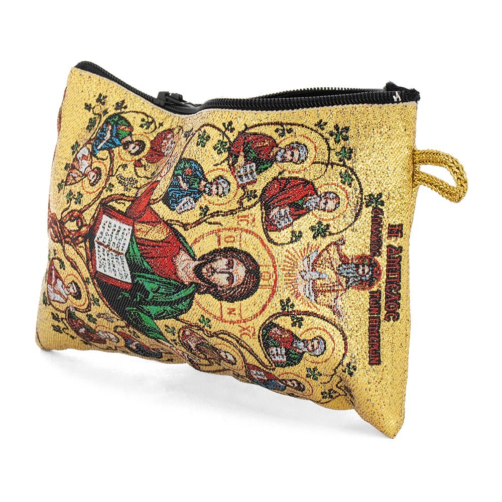 Made of cloth with zipper fastening and golden string. It features an image depicting Christ Pantocrator on both the front and back.